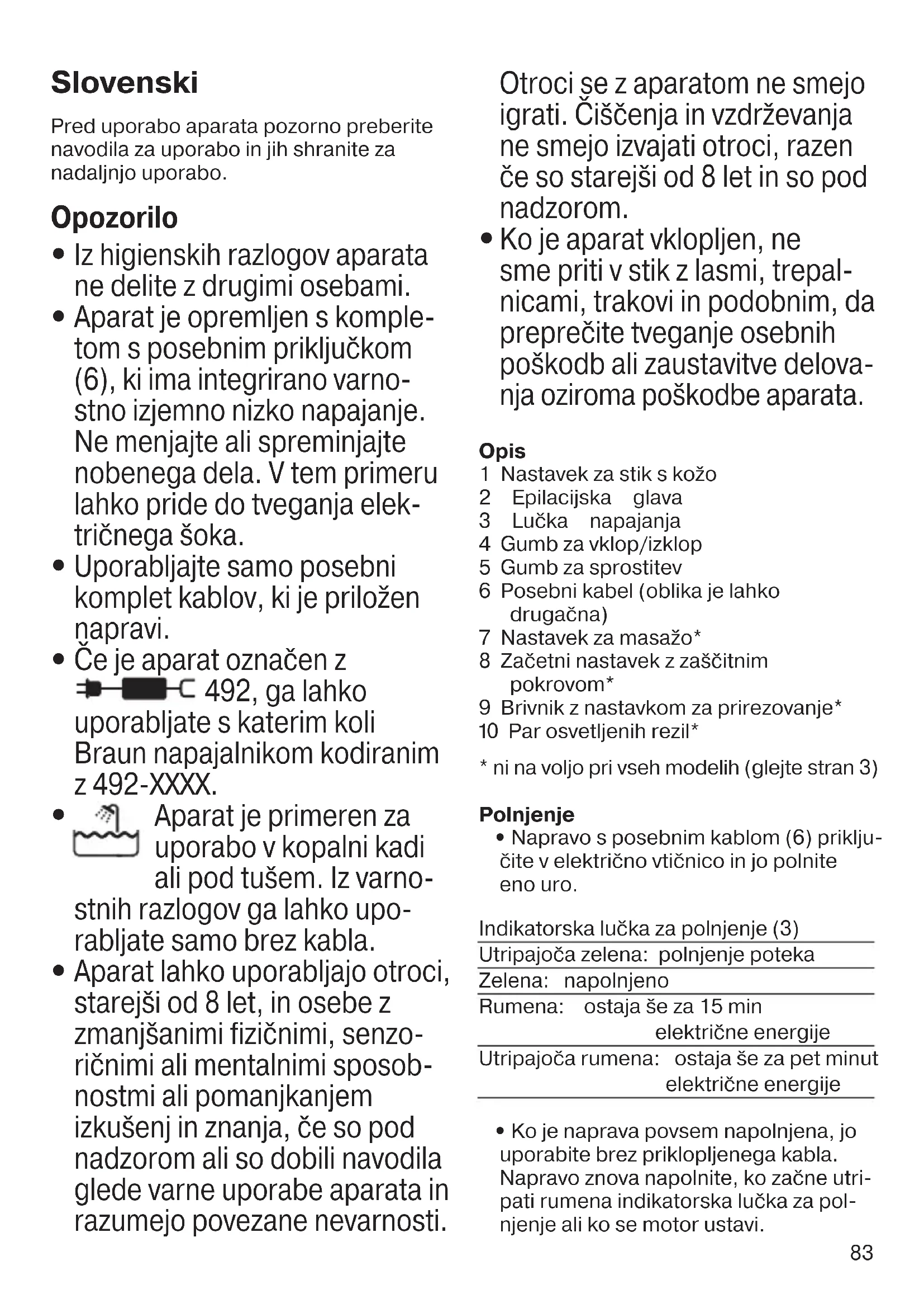 Če je aparat označen z 492, ga lahko uporabljate s katerim koli Braun napajalnikom kodiranim z 492-XXXX.
