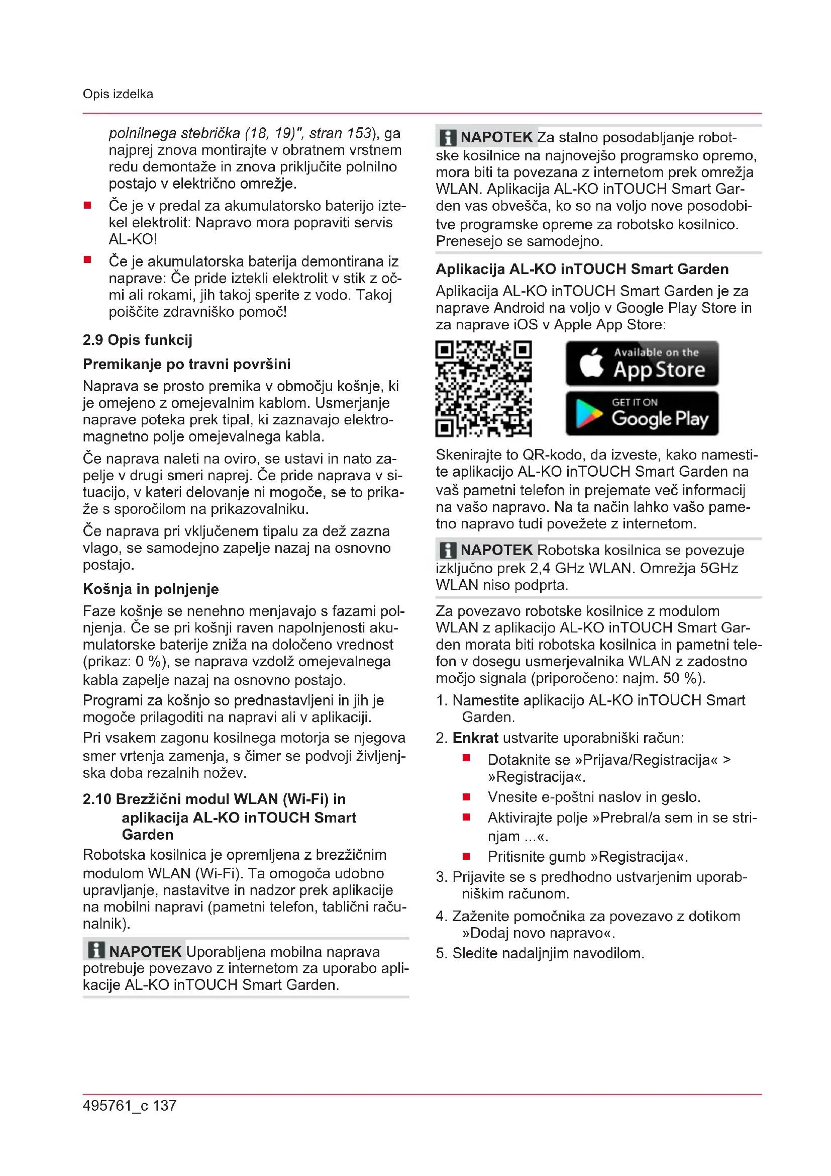 aplikacija AL-KO inTOUCH Smart Garden Robotska kosilnica je opremljena z brezžičnim modulom WLAN (Wi-Fi). Ta omogoča udobno upravljanje, nastavitve in nadzor prek aplikacije na mobilni napravi (pametni telefon, tablični raču- nalnik). NAPOTEK Uporabljena mobilna naprava potrebuje povezavo z internetom za uporabo apli- kacije AL-KO inTOUCH Smart Garden. NAPOTEK Za stalno posodabljanje robot- ske kosilnice na najnovejšo programsko opremo, mora biti ta povezana z internetom prek omrežja WLAN. Aplikacija AL-KO inTOUCH Smart Gar- den vas obvešča, ko so na voljo nove posodobi- tve programske opreme za robotsko kosilnico. Prenesejo se samodejno. Aplikacija AL-KO inTOUCH Smart Garden Aplikacija AL-KO inTOUCH Smart Garden je za naprave Android na voljo v Google Play Store in za naprave iOS v Apple App Store: Skenirajte to QR-kodo, da izveste, kako namesti- te aplikacijo AL-KO inTOUCH Smart Garden na vaš pametni telefon in prejemate več informacij na vašo napravo. Na ta način lahko vašo pame- tno napravo tudi povežete z internetom. NAPOTEK Robotska kosilnica se povezuje izključno prek 2,4GHz WLAN. Omrežja 5GHz WLAN niso podprta. Za povezavo robotske kosilnice z modulom WLAN z aplikacijo AL-KO inTOUCH Smart Gar- den morata biti robotska kosilnica in pametni tele- fon v dosegu usmerjevalnika WLAN z zadostno močjo signala (priporočeno: najm.50%).