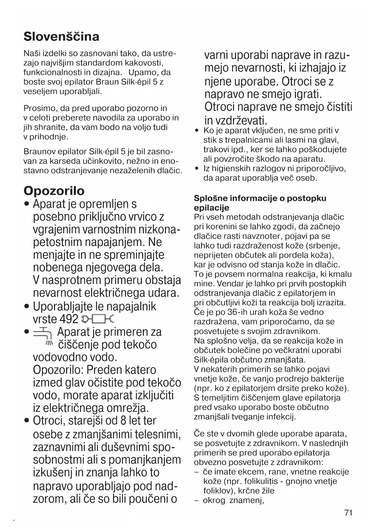 b Krajšanje obrobnih dlačic: izberite « ». c Prirezovanje dlačic na dolžino 5 mm: izberite « » in namestite nastavek za prirezovanje (I). d Čiščenje: Mrežice brivnika (II) ne čistite s ščetko, saj lahko tako mrežico poškodujete. e Dele brivnika morate redno, vsake tri mesece, namazati. f Zunanji okvir mrežice (II) in blok rezil (III) morate zamenjati, ko opazite slabšo učinkovitost britja. Rezervni deli so na voljo pri vašem prodajalcu, servisnih centrih Braun ali na spletnem mestu www.service. braun.com. Ne brijte se, če je mrežica poškodovana. Odstranjevanje Izdelek vsebuje baterije in reciklirne električne odpadke. Za zaščito okolja izdelka ne odlagajte med gospodinjske odpadke, ampak ga odnesite na ustrezna lokalna zbirna mesta. Podatki se lahko spremenijo brez vnaprejšnjega opozorila. Garancijski list Za izdelek velja dveletna garancija, ki začne veljati z datumom izročitve blaga. Proizvajalec jamči, da bo izdelek deloval v garancijskem roku ob pravilni uporabi v skladu z njegovim namenom in 90340813_SE5_Power_MN.indd 7390340813_SE5_Power_MN.indd 73 02.06.22 10:4902.06.22 10:4974 priloženimi navodili. V garancijski dobi bomo brezplačno odpravili vse okvare izdelka, ki so posledica napak v materialu ali izdelavi, tako da vam bomo izdelek po naši presoji popravili ali v celoti zamenjali. Če pooblaščeni servis vašega izdelka ne popravi v 45 dneh, imate pravico zahtevati nov izdelek. Za sprejem v reklamacijo se šteje dan, ko je izdelek sprejet v poobla- ščeni servis, pri prodajalcu (distributerju) ali v trgovino, kjer ste izdelek kupili. Čas zagotavljanja servisa, vzdrževanja, nadomestnih delov in priklopnih aparatov je 3 leta po preteku garancijskega roka. Popravila na domu zaradi zahtevnosti in neprenosljivosti sodobne servisne opreme in razpoložljivosti rezervnih delov niso mogoča. Garancija velja na območju Republike Slovenije, pa tudi v vseh državah, kjer izdelek dobavlja podjetje Braun ali njegov pooblaščeni distributer. Garancija ne izključuje pravic potrošnika, ki izhajajo iz odgovornosti prodajalca za napake na blagu. Garancija ne velja: – Za okvare, ki so posledica nepravilne uporabe, normalne obrabe ali rabe oziroma napake, ki imajo zanemarljiv učinek na vrednost in delovanje izdelka. – Ob vsakem posegu nepooblaščene osebe ali kakršnekoli druge predelave izdelka in če pri popravilu niso uporabljeni originalni Braunovi rezervni deli. Za popravilo v garancijski dobi celotno napravo skupaj z računom in/ali izpolnjenim garancijskim listom odnesite ali pošljite na pooblaščeni servisni center Braun: Jože Ježek Cesta 24. junija 21 1231 Črnuče – Ljubljana Tel. št.: +386 1 561 66 30 E-mail: jezektrg.servis@siol.net Potrošnik lahko zahtevo za popravilo v garancijski dobi za celotno napravo, skupaj z računom in/ali izpolnjenim garancijskim listom, prav tako uveljavlja tudi pri prodajalcu ali pri proizvajalcu (distributerju). Za dodatne informacije smo vam na voljo na brezplačni telefonski številki