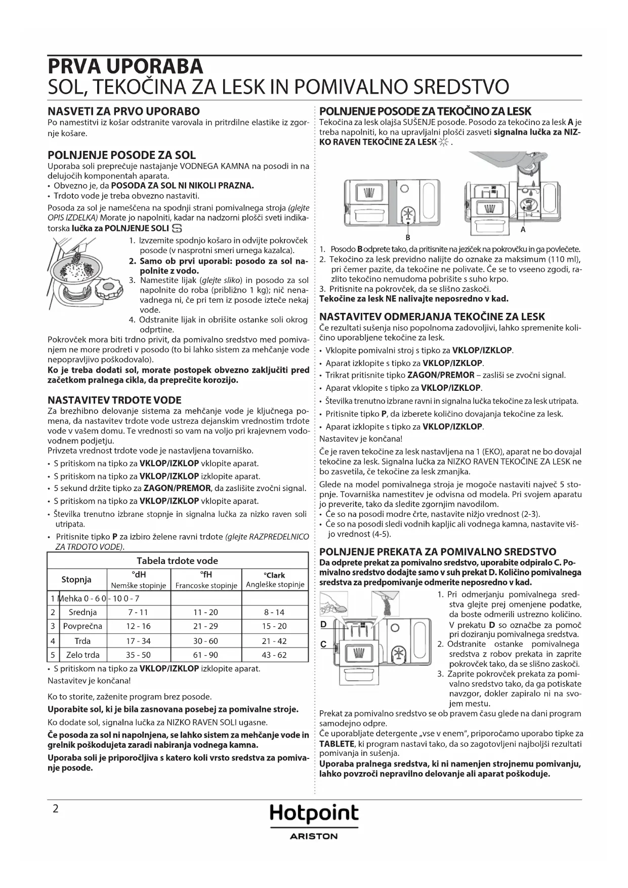 - Pritisnite tipko P za izbiro želene ravni trdote (glejte RAZPREDELNICO ZA TRDOTO VODE).• S pritiskom na tipko za VKLOP/IZKLOP izklopite aparat.Nastavitev je končana!Ko to storite, zaženite program brez posode.Uporabite sol, ki je bila zasnovana posebej za pomivalne stroje.Ko dodate sol, signalna lučka za NIZKO RAVEN SOLI ugasne.Če posoda za sol ni napolnjena, se lahko sistem za mehčanje vode in grelnik poškodujeta zaradi nabiranja vodnega kamna.Uporaba soli je priporočljiva s katero koli vrsto sredstva za pomiva-nje posode. Tabela trdote vode Stopnja °dH Nemške stopinje °fH Francoske stopinje°Clark Angleške stopinje1 Mehka 0 - 6 0 - 10 0 - 7 2 Srednja 7 - 11 11 - 20 8 - 14 3 Povprečna 12 - 16 21 - 29 15 - 20 4 Trda 17 - 34 30 - 60 21 - 42 5 Zelo trda 35 - 50 61 - 90 43 - 62 POLNJENJE POSODE ZA TEKOČINO ZA LESK Tekočina za lesk olajša SUŠENJE posode. Posodo za tekočino za lesk A je treba napolniti, ko na upravljalni plošči zasveti signalna lučka za NIZ- KO RAVEN TEKOČINE ZA LESK .