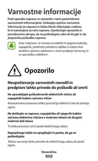 Varnostne informacije Pred uporabo naprave se seznanite s temi pomembnimi varnostnimi informacijami. Vsebujejo splošne varnostne informacije za naprave in lahko hkrati vključujejo vsebino, ki ni namenjena za vašo napravo. Upoštevajte opozorila in previdnostne ukrepe, da ne poškodujete sebe ali drugih in da preprečite poškodbo naprave. Izraz »naprava« se nanaša na izdelek in njegovo baterijo, napajalnik, predmete priložene izdelku in katero koli dodatno opremo odobreno s strani podjetja Samsung, ki se uporablja z izdelkom.
