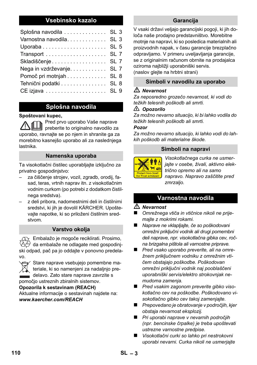 Splošna navodila Spoštovani kupec, Pred prvo uporabo Vaše naprave preberite to originalno navodilo za uporabo, ravnajte se po njem in shranite ga za morebitno kasnejšo uporabo ali za naslednjega lastnika. V vsaki državi veljajo garancijski pogoji, ki jih določa naše prodajno predstavništvo. Morebitne motnje na napravi, ki so posledica materialnih ali proizvodnih napak, v času garancije brezplačno odpravljamo. V primeru uveljavljanja garancije, se z originalnim računom obrnite na prodajalca oziroma najbližji uporabniški servis. (naslov glejte na hrbtni strani) Simboli v navodilu za uporabo Nevarnost Za neposredno grozečo nevarnost, ki vodi do težkih telesnih poškodb ali smrti. 몇 Opozorilo Za možno nevarno situacijo, ki bi lahko vodila do težkih telesnih poškodb ali smrti. Pozor Za možno nevarno situacijo, ki lahko vodi do lahkih poškodb ali materialne škode. Simboli na napravi Namenska uporaba Ta visokotlačni čistilec uporabljajte izključno za privatno gospodinjstvo: – za čiščenje strojev, vozil, zgradb, orodij, fasad, teras, vrtnih naprav itn. z visokotlačnim vodnim curkom (po potrebi z dodatkom čistilnega sredstva). – z deli pribora, nadomestnimi deli in čistilnimi sredstvi, ki jih je dovolil KÄRCHER. Upoštevajte napotke, ki so priloženi čistilnim sredstvom. Varstvo okolja Embalažo je mogoče reciklirati. Prosimo, da embalaže ne odlagate med gospodinjski odpad, pač pa jo oddajte v ponovno predelavo. Stare naprave vsebujejo pomembne materiale, ki so namenjeni za nadaljnjo predelavo. Zato stare naprave zavrzite s pomočjo ustreznih zbiralnih sistemov. Opozorila k sestavinam (REACH) Aktualne informacije o sestavinah najdete na: www.kaercher.com/REACH Visokotlačnega curka ne usmerjajte v osebe, živali, aktivno električno opremo ali na samo napravo. Napravo zaščitite pred zmrzaljo. Varnostna navodila Nevarnost Omrežnega vtiča in vtičnice nikoli ne prijemajte z mokrimi rokami. Naprave ne vklapljajte, če so poškodovani