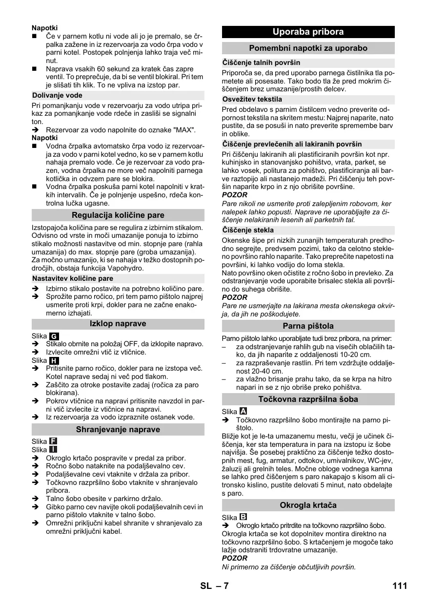 Napravo postavite na trdno podlago. Vtaknite omrežni vtič v vtičnico. S položaja OFF z izbirnim stikalom zavrtite na področje izbire Moč pare. Prikaz za gretje utripa zeleno. Počakajte, dokler prikaz za gretje ne sveti konstantno. Parni čistilnik je pripravljen za uporabo. SL – 6 Napotki Če v parnem kotlu ni vode ali jo je premalo, se črpalka zažene in iz rezervoarja za vodo črpa vodo v parni kotel. Postopek polnjenja lahko traja več minut. Naprava vsakih 60 sekund za kratek čas zapre ventil. To preprečuje, da bi se ventil blokiral. Pri tem je slišati tih klik. To ne vpliva na izstop par. Dolivanje vode Pri pomanjkanju vode v rezervoarju za vodo utripa prikaz za pomanjkanje vode rdeče in zasliši se signalni ton. Rezervoar za vodo napolnite do oznake "MAX". Napotki Vodna črpalka avtomatsko črpa vodo iz rezervoarja za vodo v parni kotel vedno, ko se v parnem kotlu nahaja premalo vode. Če je rezervoar za vodo prazen, vodna črpalka ne more več napolniti parnega kotlička in odvzem pare se blokira. Vodna črpalka poskuša parni kotel napolniti v kratkih intervalih. Če je polnjenje uspešno, rdeča kontrolna lučka ugasne. Regulacija količine pare Izstopajoča količina pare se regulira z izbirnim stikalom. Odvisno od vrste in moči umazanije ponuja to izbirno stikalo možnosti nastavitve od min. stopnje pare (rahla umazanija) do max. stopnje pare (groba umazanija). Za močno umazanijo, ki se nahaja v težko dostopnih področjih, obstaja funkcija Vapohydro. Nastavitev količine pare Izbirno stikalo postavite na potrebno količino pare. Sprožite parno ročico, pri tem parno pištolo najprej usmerite proti krpi, dokler para ne začne enakomerno izhajati. Uporaba pribora Pomembni napotki za uporabo Čiščenje talnih površin Priporoča se, da pred uporabo parnega čistilnika tla pometete ali posesate. Tako bodo tla že pred mokrim čiščenjem brez umazanije/prostih delcev. Osvežitev tekstila Pred obdelavo s parnim čistilcem vedno preverite odpornost tekstila na skritem mestu: Najprej naparite, nato pustite, da se posuši in nato preverite spremembe barv in oblike. Čiščenje prevlečenih ali lakiranih površin Pri čiščenju lakiranih ali plastificiranih površin kot npr. kuhinjsko in stanovanjsko pohištvo, vrata, parket, se lahko vosek, politura za pohištvo, plastificiranja ali barve raztopijo ali nastanejo madeži. Pri čiščenju teh površin naparite krpo in z njo obrišite površine. POZOR Pare nikoli ne usmerite proti zalepljenim robovom, ker nalepek lahko popusti. Naprave ne uporabljajte za čiščenje nelakiranih lesenih ali parketnih tal. Čiščenje stekla Okenske šipe pri nizkih zunanjih temperaturah predhodno segrejte, predvsem pozimi, tako da celotno stekleno površino rahlo naparite. Tako preprečite napetosti na površini, ki lahko vodijo do loma stekla. Nato površino oken očistite z ročno šobo in prevleko. Za odstranjevanje vode uporabite brisalec stekla ali površino do suhega obrišite. POZOR Pare ne usmerjajte na lakirana mesta okenskega okvirja, da jih ne poškodujete. Izklop naprave Parna pištola Slika Stikalo obrnite na položaj OFF, da izklopite napravo. Izvlecite omrežni vtič iz vtičnice. Slika Pritisnite parno ročico, dokler para ne izstopa več. Kotel naprave sedaj ni več pod tlakom. Zaščito za otroke postavite zadaj (ročica za paro blokirana). Pokrov vtičnice na napravi pritisnite navzdol in parni vtič izvlecite iz vtičnice na napravi. Iz rezervoarja za vodo izpraznite ostanek vode. Parno pištolo lahko uporabljate tudi brez pribora, na primer: – za odstranjevanje rahlih gub na visečih oblačilih tako, da jih naparite z oddaljenosti 10-20 cm. – za razpraševanje rastlin. Pri tem vzdržujte oddaljenost 20-40 cm. – za vlažno brisanje prahu tako, da se krpa na hitro napari in se z njo obriše preko pohištva. Shranjevanje naprave Slika Slika Okroglo krtačo pospravite v predal za pribor. Ročno šobo nataknite na podaljševalno cev. Podaljševalne cevi vtaknite v držala za pribor. Točkovno razpršilno šobo vtaknite v shranjevalo pribora. Talno šobo obesite v parkirno držalo. Gibko parno cev navijte okoli podaljševalnih cevi in parno pištolo vtaknite v talno šobo. Omrežni priključni kabel shranite v shranjevalo za omrežni priključni kabel. Točkovna razpršilna šoba Slika Točkovno razpršilno šobo montirajte na parno pištolo. Bližje kot je le-ta umazanemu mestu, večji je učinek čiščenja, ker sta temperatura in para na izstopu iz šobe najvišja. Še posebej praktično za čiščenje težko dostopnih mest, fug, armatur, odtokov, umivalnikov, WC-jev, žaluzij ali grelnih teles. Močne obloge vodnega kamna se lahko pred čiščenjem s paro nakapajo s kisom ali citronsko kislino, pustite delovati 5 minut, nato obdelajte s paro. Okrogla krtača Slika Okroglo krtačo pritrdite na točkovno razpršilno šobo. Okrogla krtača se kot dopolnitev montira direktno na točkovno razpršilno šobo. S krtačenjem je mogoče tako lažje odstraniti trdovratne umazanije. POZOR Ni primerno za čiščenje občutljivih površin. SL – 7