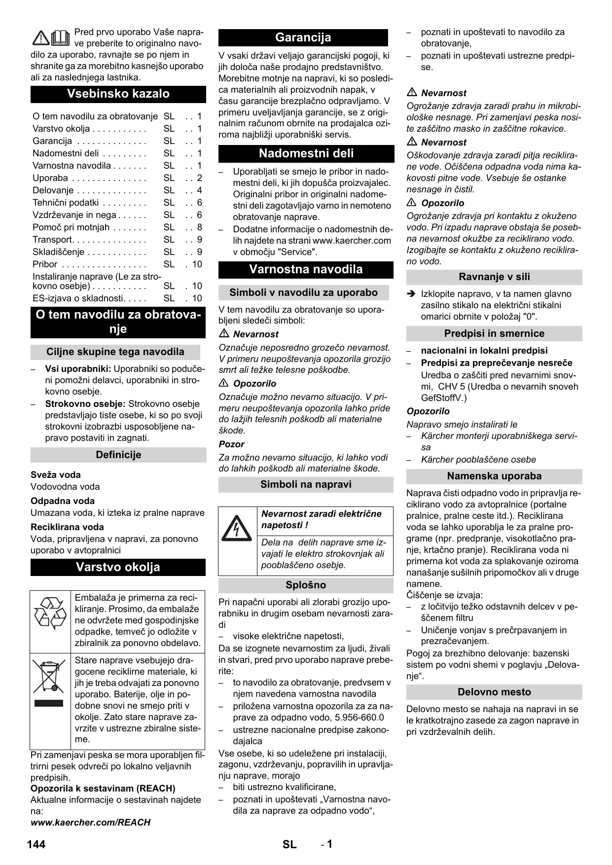 Uporabljati se smejo le pribor in nadomestni deli, ki jih dopušča proizvajalec. Originalni pribor in originalni nadomestni deli zagotavljajo varno in nemoteno obratovanje naprave. Dodatne informacije o nadomestnih delih najdete na strani www.kaercher.com v območju "Service". Varnostna navodila Simboli v navodilu za uporabo V tem navodilu za obratovanje so uporabljeni sledeči simboli: Nevarnost Označuje neposredno grozečo nevarnost. V primeru neupoštevanja opozorila grozijo smrt ali težke telesne poškodbe. 몇 Opozorilo Označuje možno nevarno situacijo. V primeru neupoštevanja opozorila lahko pride do lažjih telesnih poškodb ali materialne škode. Pozor Za možno nevarno situacijo, ki lahko vodi do lahkih poškodb ali materialne škode. Simboli na napravi Nevarnost zaradi električne napetosti ! Dela na delih naprave sme izvajati le elektro strokovnjak ali pooblaščeno osebje. Splošno Embalaža je primerna za recikliranje. Prosimo, da embalaže ne odvržete med gospodinjske odpadke, temveč jo odložite v zbiralnik za ponovno obdelavo. Stare naprave vsebujejo dragocene reciklirne materiale, ki jih je treba odvajati za ponovno uporabo. Baterije, olje in podobne snovi ne smejo priti v okolje. Zato stare naprave zavrzite v ustrezne zbiralne sisteme. Pri zamenjavi peska se mora uporabljen filtrirni pesek odvreči po lokalno veljavnih predpisih. Opozorila k sestavinam (REACH) Aktualne informacije o sestavinah najdete na: www.kaercher.com/REACH