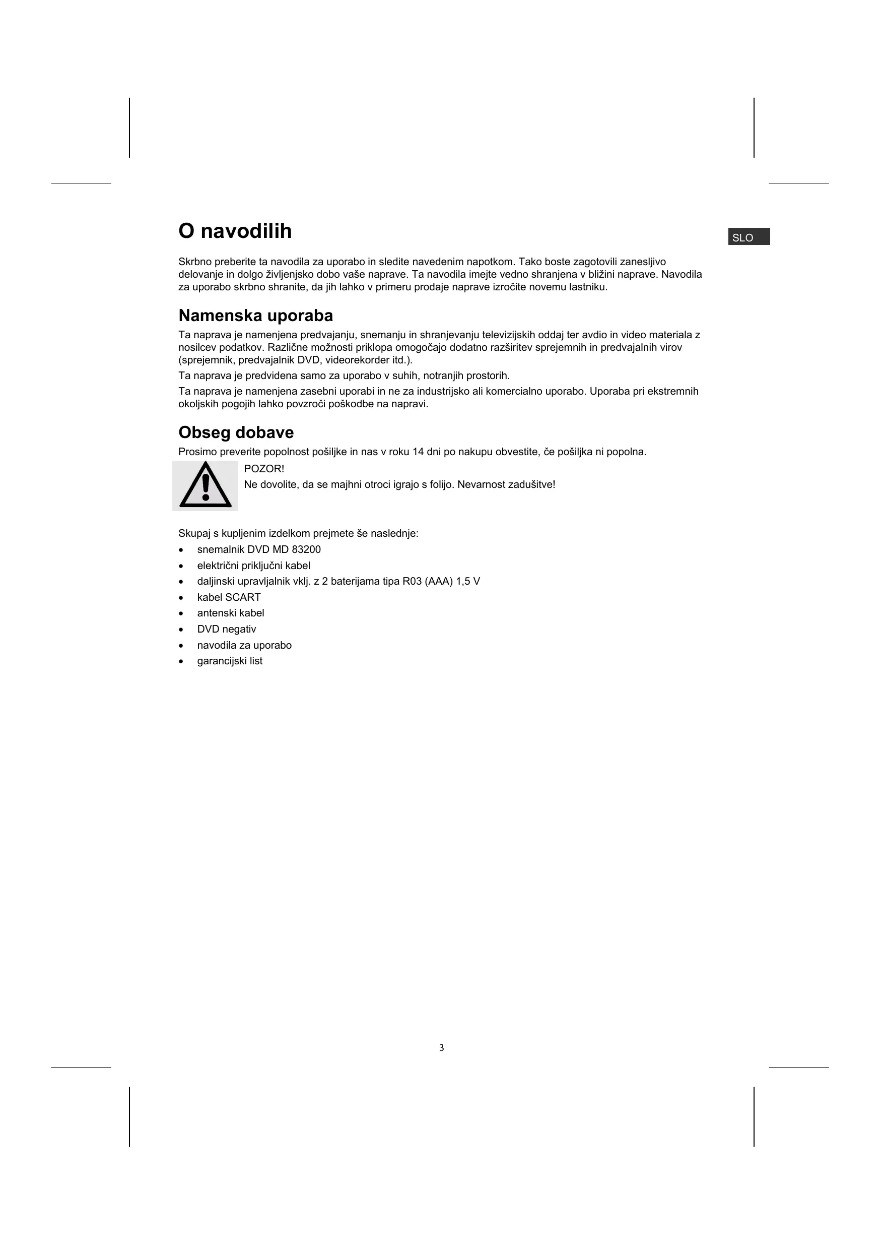 SLO Namenska uporaba Ta naprava je namenjena predvajanju, snemanju in shranjevanju televizijskih oddaj ter avdio in video materiala z nosilcev podatkov. Različne možnosti priklopa omogočajo dodatno razširitev sprejemnih in predvajalnih virov (sprejemnik, predvajalnik DVD, videorekorder itd.). Ta naprava je predvidena samo za uporabo v suhih, notranjih prostorih. Ta naprava je namenjena zasebni uporabi in ne za industrijsko ali komercialno uporabo. Uporaba pri ekstremnih okoljskih pogojih lahko povzroči poškodbe na napravi.