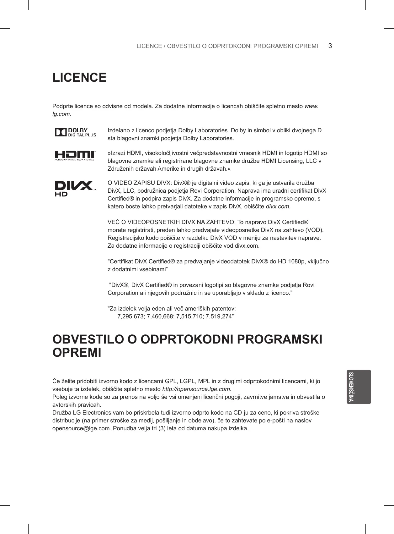 LICENCE Podprte licence so odvisne od modela. Za dodatne informacije o licencah obiščite spletno mesto www. lg.com. Izdelano z licenco podjetja Dolby Laboratories. Dolby in simbol v obliki dvojnega D sta blagovni znamki podjetja Dolby Laboratories. »Izrazi HDMI, visokoločljivostni večpredstavnostni vmesnik HDMI in logotip HDMI so blagovne znamke ali registrirane blagovne znamke družbe HDMI Licensing, LLC v Združenih državah Amerike in drugih državah.« O VIDEO ZAPISU DIVX: DivX® je digitalni video zapis, ki ga je ustvarila družba DivX, LLC, podružnica podjetja Rovi Corporation. Naprava ima uradni certifikat DivX Certified® in podpira zapis DivX. Za dodatne informacije in programsko opremo, s katero boste lahko pretvarjali datoteke v zapis DivX, obiščite divx.com. VEČ O VIDEOPOSNETKIH DIVX NA ZAHTEVO: To napravo DivX Certified® morate registrirati, preden lahko predvajate videoposnetke DivX na zahtevo (VOD). Registracijsko kodo poiščite v razdelku DivX VOD v meniju za nastavitev naprave. Za dodatne informacije o registraciji obiščite vod.divx.com. "Certifikat DivX Certified® za predvajanje videodatotek DivX® do HD 1080p, vključno z dodatnimi vsebinami” "DivX®, DivX Certified® in povezani logotipi so blagovne znamke podjetja Rovi Corporation ali njegovih podružnic in se uporabljajo v skladu z licenco." "Za izdelek velja eden ali več ameriških patentov: 7,295,673; 7,460,668; 7,515,710; 7,519,274”