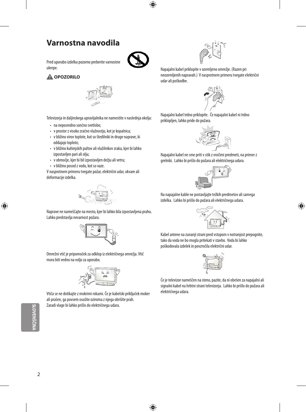 - v bližino posod z vodo, kot so vaze. V nasprotnem primeru tvegate požar, električni udar, okvare ali deformacije izdelka. Napajalni kabel priklopite v ozemljeno omrežje. (Razen pri neozemljenih napravah.) V nasprotnem primeru tvegate električni udar ali poškodbe. Napajalni kabel trdno priklopite. Če napajalni kabel ni trdno priklopljen, lahko pride do požara. Napajalni kabel ne sme priti v stik z vročimi predmeti, na primer z grelniki. Lahko bi prišlo do požara ali električnega udara. Na napajalne kable ne postavljajte težkih predmetov ali samega izdelka. Lahko bi prišlo do požara ali električnega udara. Naprave ne nameščajte na mesto, kjer bi lahko bila izpostavljena prahu. Lahko predstavlja nevarnost požara. Kabel antene na zunanji strani pred vstopom v notranjost prepognite, tako da voda ne bo mogla pritekati v stavbo. Voda bi lahko poškodovala izdelek in povzročila električni udar. Omrežni vtič je pripomoček za odklop iz električnega omrežja. Vtič mora biti vedno na voljo za uporabo. SLOVENŠČINA Vtiča se ne dotikajte z mokrimi rokami. Če je kabelski priključek moker ali prašen, ga povsem osušite oziroma z njega obrišite prah. Zaradi vlage bi lahko prišlo do električnega udara.