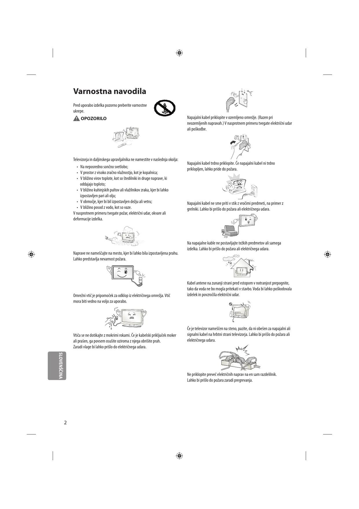 in ga shranite za prihodnjo uporabo. www.lg.com Varnostna navodila Pred uporabo izdelka pozorno preberite varnostne ukrepe. OPOZORILO Televizorja in daljinskega upravljalnika ne namestite v naslednja okolja: t Na neposredno sončno svetlobo; t V prostor z visoko zračno vlažnostjo, kot je kopalnica; t V bližino virov toplote, kot so štedilniki in druge naprave, ki oddajajo toploto; t V bližino kuhinjskih pultov ali vlažilnikov zraka, kjer bi lahko izpostavljen pari ali olju; t V območje, kjer bi bil izpostavljen dežju ali vetru; t V bližino posod z vodo, kot so vaze. V nasprotnem primeru tvegate požar, električni udar, okvare ali deformacije izdelka. Naprave ne nameščajte na mesto, kjer bi lahko bila izpostavljena prahu. Lahko predstavlja nevarnost požara. Omrežni vtič je pripomoček za odklop iz električnega omrežja. Vtič mora biti vedno na voljo za uporabo. Vtiča se ne dotikajte z mokrimi rokami. Če je kabelski priključek moker ali prašen, ga povsem osušite oziroma z njega obrišite prah. Zaradi vlage bi lahko prišlo do električnega udara. Napajalni kabel priklopite v ozemljeno omrežje. (Razen pri neozemljenih napravah.) V nasprotnem primeru tvegate električni udar ali poškodbe. Napajalni kabel trdno priklopite. Če napajalni kabel ni trdno priklopljen, lahko pride do požara. Napajalni kabel ne sme priti v stik z vročimi predmeti, na primer z grelniki. Lahko bi prišlo do požara ali električnega udara. Na napajalne kable ne postavljajte težkih predmetov ali samega izdelka. Lahko bi prišlo do požara ali električnega udara. Kabel antene na zunanji strani pred vstopom v notranjost prepognite, tako da voda ne bo mogla pritekati v stavbo. Voda bi lahko poškodovala izdelek in povzročila električni udar. Če je televizor nameščen na steno, pazite, da ni obešen za napajalni ali signalni kabel na hrbtni strani televizorja. Lahko bi prišlo do požara ali električnega udara. SLOVENŠČINA Ne priklopite preveč električnih naprav na en sam razdelilnik. Lahko bi prišlo do požara zaradi pregrevanja.
