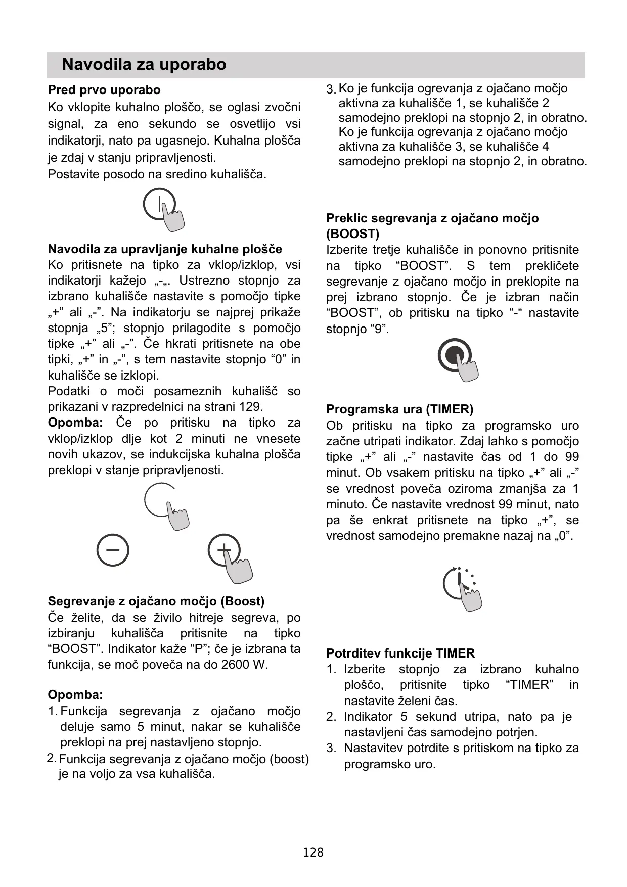 Navodila za uporabo Pred prvo uporabo Ko vklopite kuhalno ploëéo, se oglasi zvoëni signal, za eno sekundo se osvetlijo vsi indikatorji, nato pa ugasnejo. Kuhalna ploëéa je zdaj v stanju pripravljenosti. Postavite posodo na sredino kuhalisëa.