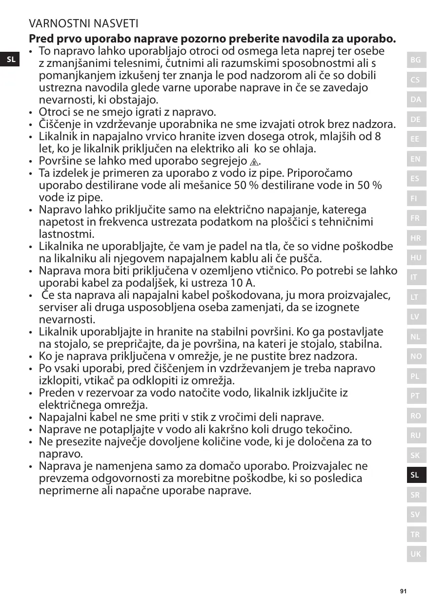Varnostni nasveti Pred prvo uporabo naprave pozorno preberite navodila za uporabo. • To napravo lahko uporabljajo otroci od osmega leta naprej ter osebe z zmanjšanimi telesnimi, čutnimi ali razumskimi sposobnostmi ali s pomanjkanjem izkušenj ter znanja le pod nadzorom ali če so dobili ustrezna navodila glede varne uporabe naprave in če se zavedajo nevarnosti, ki obstajajo. • Otroci se ne smejo igrati z napravo. • Čiščenje in vzdrževanje uporabnika ne sme izvajati otrok brez nadzora. • Likalnik in napajalno vrvico hranite izven dosega otrok, mlajših od 8 let, ko je likalnik priključen na elektriko ali ko se ohlaja. • Površine se lahko med uporabo segrejejo . • Ta izdelek je primeren za uporabo z vodo iz pipe. Priporočamo uporabo destilirane vode ali mešanice 50 % destilirane vode in 50 % vode iz pipe. • Napravo lahko priključite samo na električno napajanje, katerega napetost in frekvenca ustrezata podatkom na ploščici s tehničnimi lastnostmi. • Likalnika ne uporabljajte, če vam je padel na tla, če so vidne poškodbe na likalniku ali njegovem napajalnem kablu ali če pušča. • Naprava mora biti priključena v ozemljeno vtičnico. Po potrebi se lahko uporabi kabel za podaljšek, ki ustreza 10 A. • Če sta naprava ali napajalni kabel poškodovana, ju mora proizvajalec, serviser ali druga usposobljena oseba zamenjati, da se izognete nevarnosti. • Likalnik uporabljajte in hranite na stabilni površini. Ko ga postavljate na stojalo, se prepričajte, da je površina, na kateri je stojalo, stabilna. • Ko je naprava priključena v omrežje, je ne pustite brez nadzora. • Po vsaki uporabi, pred čiščenjem in vzdrževanjem je treba napravo izklopiti, vtikač pa odklopiti iz omrežja. • Preden v rezervoar za vodo natočite vodo, likalnik izključite iz električnega omrežja. • Napajalni kabel ne sme priti v stik z vročimi deli naprave. • Naprave ne potapljajte v vodo ali kakršno koli drugo tekočino. • Ne presezite največje dovoljene količine vode, ki je določena za to napravo. • Naprava je namenjena samo za domačo uporabo. Proizvajalec ne prevzema odgovornosti za morebitne poškodbe, ki so posledica neprimerne ali napačne uporabe naprave.