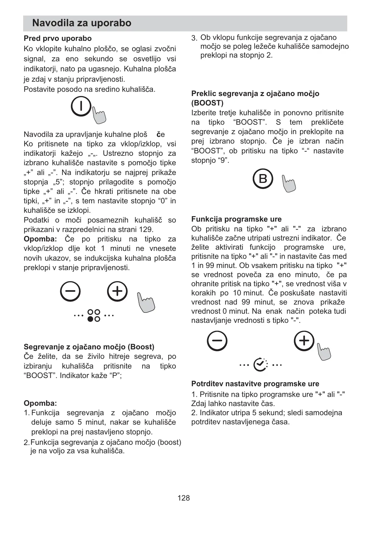 Navodila za upravljanje kuhalne ploš Ko pritisnete na tipko za vklop/izklop, vsi indikatorji kažejo „-„. Ustrezno stopnjo za izbrano kuhališ e nastavite s pomo jo tipke „+” ali „-”. Na indikatorju se najprej prikaže stopnja „5”; stopnjo prilagodite s pomo jo tipke „+” ali „-”. e hkrati pritisnete na obe tipki, „+” in „-”, s tem nastavite stopnjo “0” in kuhališ e se izklopi. Podatki o mo i posameznih kuhališ so prikazani v razpredelnici na strani 129. e po pritisku na tipko za Opomba: vklop/izklop dlje kot 1 minuti ne vnesete novih ukazov, se indukcijska kuhalna ploš a preklopi v stanje pripravljenosti. Funkcija programske ure Ob pritisku na tipko "+" ali "-" za izbrano kuhališče začne utripati ustrezni indikator. Če želite aktivirati funkcijo programske ure, pritisnite na tipko "+" ali "-" in nastavite čas med 1 in 99 minut. Ob vsakem pritisku na tipko "+" se vrednost poveča za eno minuto, če pa ohranite pritisk na tipko "+", se vrednost viša v korakih po 10 minut. Če poskušate nastaviti vrednost nad 99 minut, se znova prikaže vrednost 0 minut. Na enak način poteka tudi nastavljanje vrednosti s tipko "-". Segrevanje z oja ano mo jo (Boost) e želite, da se živilo hitreje segreva, po izbiranju kuhališ a pritisnite na tipko “BOOST”. Indikator kaže “P”; Opomba: