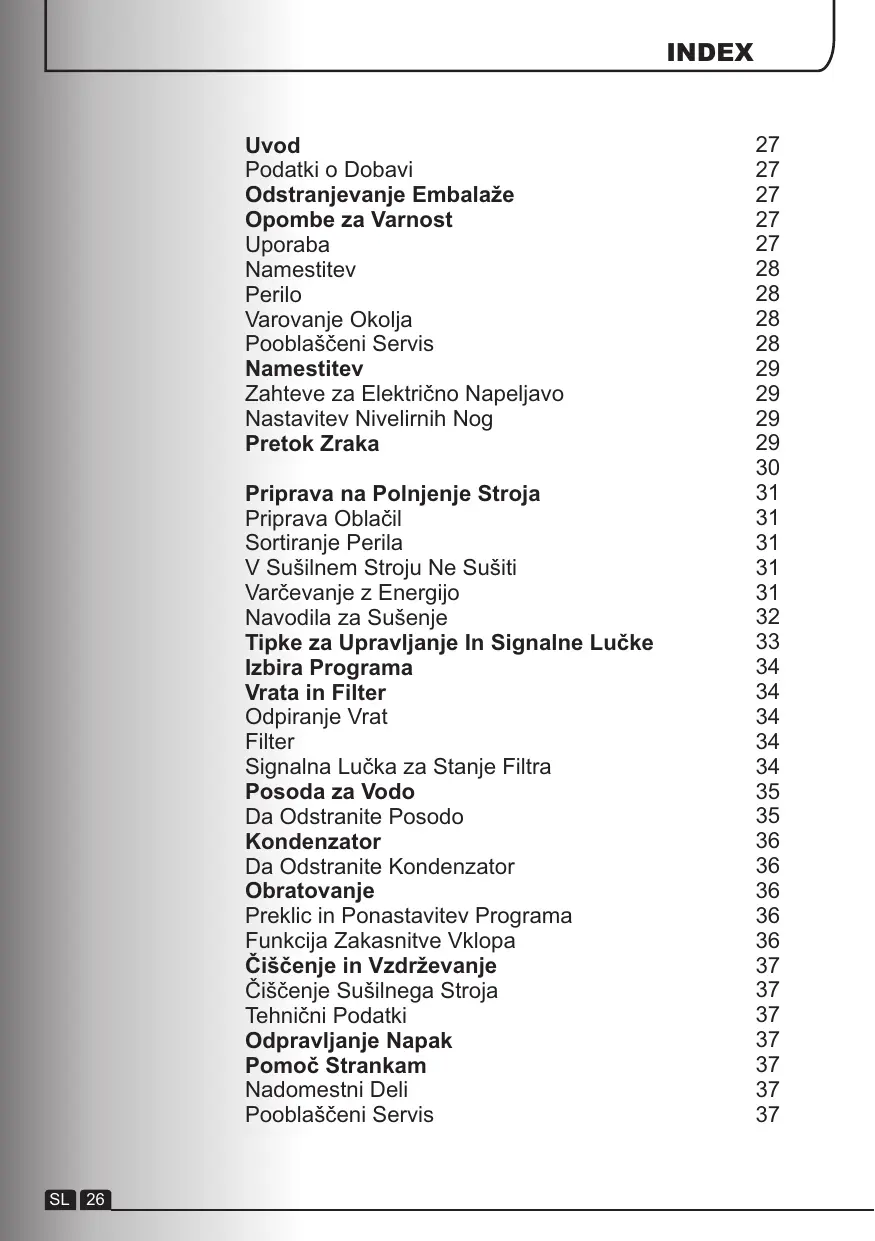 Informacije za testne laboratorije ● Zunanjost stroja in vrata obrišite z mehko krpo. ● NE UPORABLJAJTE grobih gobic, krpic ali čistil. Program EN 61121 Ustrezni Program - Za v omaro -Bombaž, suho -Bombaž, za likanje - Za likanje -Tkanine za lahko vzdrževanje- Za v omaro + sintetika ● Da bi preprečili nabiranje delcev tkanin in oteženo odpiranje/zapiranje vrat po vsakem zaključenem programu sušenja obrišite notranjo stran vrat in tesnilo z vlažno krpo. POMEMBNO: Preden začnete stroj čistiti, ga vedno ugasnite in izvlecite električni vtič iz vtičnice. OPOZORILO! Boben, vrata in perilo so lahko zelo vroči! Podatke o električnih delih najdete na nalepki, ki je na sprednji strani ohišja sušilnega stroja (ko so vrata odprta). SL 36 ODPRAVLJANJE NAPAK Kaj je Lahko Vzrok, da ... Napake, ki jih lahko odpravite sami Preden pokličete pooblaščeni servis za nasvet, vas prosimo, da pregledate ta seznam. Če bi se izkazalo, da stroj dela ali da je bil nepravilno uporabljen ali nameščen, vam bomo morali storitve servisa zaračunati. Če težave ne morete odpraviti z nasveti po tem seznamu, prosimo, pokličite pooblaščeni servis, saj vam bodo morda lahko pomagali po telefonu. Če sušenje traja predolgo oz. če oblačila niso dovolj suha: ● Ste izbrali pravi program/čas sušenja? ● So bile obleke preveč mokre? Ste oblačila temeljito ročno ali strojno oželi? ● Je treba očistiti filter? ● Je treba očistiti kondenzator? ● Je sušilni stroj preobremenjen? ● Ali kaj ovira dno sušilnega stroja ali dovodne in odvodne odprtine? ● Ste pri prejšnjem ciklu izbrali možnost Sušilni stroj ne deluje ... ● Ali je stroj pod napetostjo? V vtičnico priključite drugo napravo, da preverite, ali vtičnica deluje. ● Je vtič pravilno vključen v vtičnico? ● Je prišlo do napake pri oskrbi z električnim tokom? ● Je pregorela varovalka? ● So vrata pravilno zaprta? ● Ali je sušilni stroj vklopljen in vključen v vtičnico? ● Ste izbrali čas sušenja ali program sušenja? ● Ste po odprtju vrat stroj vklopili ponovno? ● Je stroj prenehal delovati, ker je posoda za zbiranje vode polna in jo je treba izprazniti? POMOČ STRANKAM Če vaš sušilni stroj še vedno ne dela niti potem, ko ste preverili vse točke na tem seznamu, vas prosimo, da za nasvet pokličete pooblaščeni servis. Morda vam bodo lahko pomagali po telefonu ali pa se boste dogovorili za primeren čas serviserjevega klica skladno z določili garancije. Vendar pa vam lahko v naslednjih primerih servisne storitve tudi zaračunamo: ● če stroj deluje; ● če stroj ni bil nameščen v skladu z navodili za Namestitev; ●če ste stroj uporabljali narobe. Nadomestni Deli Vedno uporabljajte originalne nadomestne dele, ki so na voljo pri pooblaščenem servisu. Pooblaščeni Servis Če potrebujete servisne storitve ali popravilo stroja, pokličite najbližji pooblaščeni servis. Sušilni stroj je zelo glasen ... ● Izključite stroj in za nasvet pokličite pooblaščeni servis. Signalna lučka je prižgana ... ● Je treba očistiti filter? ● Je treba očistiti kondenzator? Izdelovalec ne odgovarja za morebitne tiskarske napake v tem priročniku. Proizvajalec si pridržuje pravico do primernih sprememb svojih naprav, tako da ne spreminja njihovih osnovnih značilnosti. Signalna lučka je prižgana ... ● Je treba izprazniti posodo za vodo? SL 37