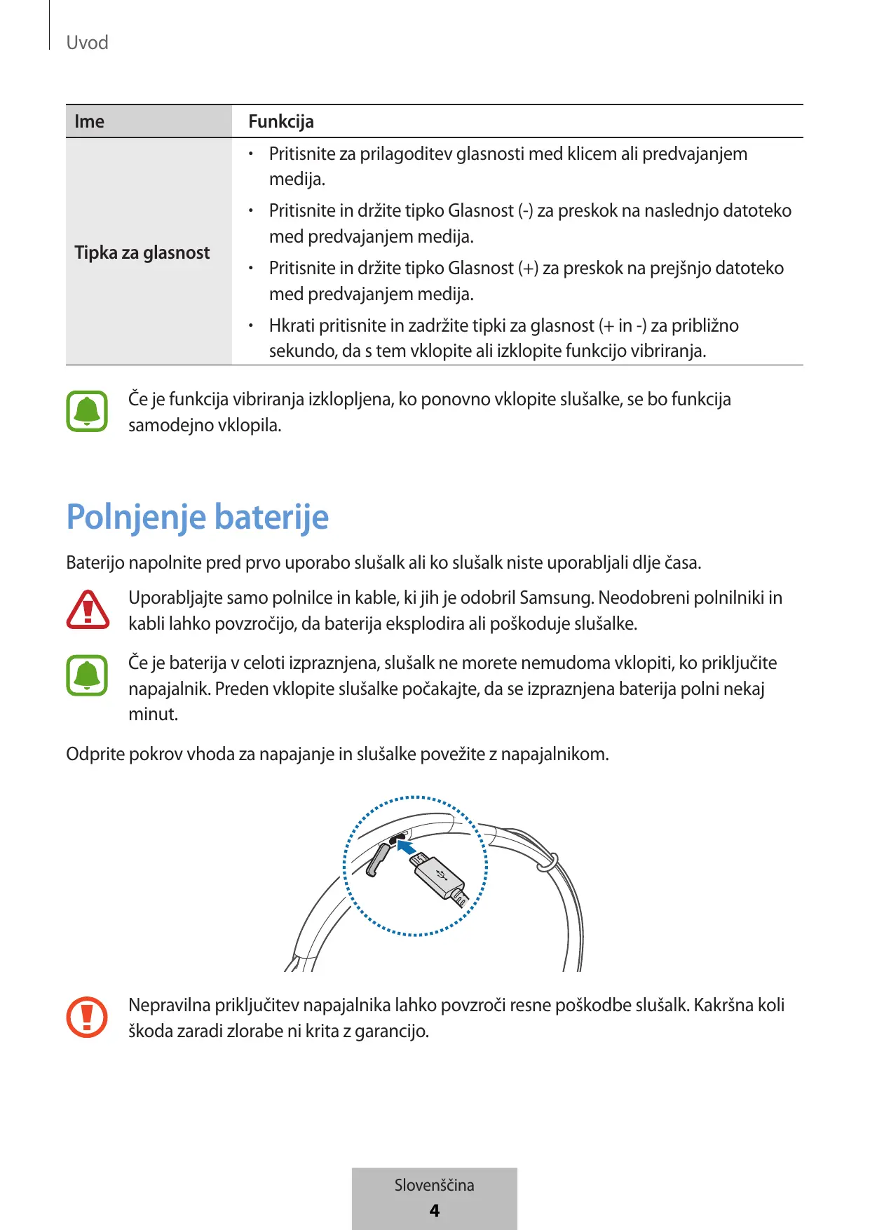 Polnjenje baterije Baterijo napolnite pred prvo uporabo slušalk ali ko slušalk niste uporabljali dlje časa. Uporabljajte samo polnilce in kable, ki jih je odobril Samsung. Neodobreni polnilniki in kabli lahko povzročijo, da baterija eksplodira ali poškoduje slušalke. Če je baterija v celoti izpraznjena, slušalk ne morete nemudoma vklopiti, ko priključite napajalnik. Preden vklopite slušalke počakajte, da se izpraznjena baterija polni nekaj minut. Odprite pokrov vhoda za napajanje in slušalke povežite z napajalnikom.