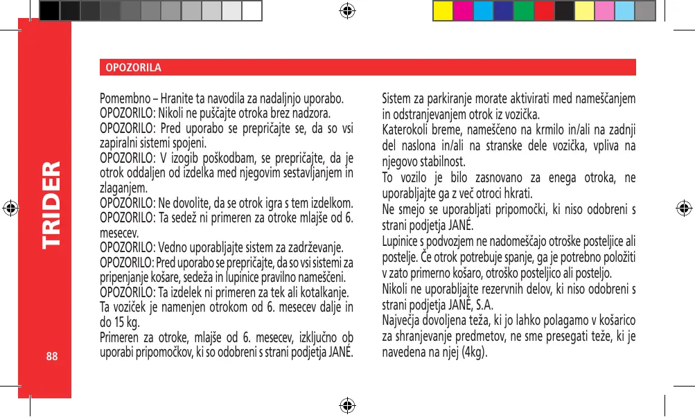 Le dispositif de stationnement doit être activé pour installer ou retirer les enfants du véhicule. Une charge quelconque suspendue au guidon, et/ou à la partie arrière du dossier, et/ou sur les côtés latéraux du véhicule peut affecter la stabilité de ce dernier. Ce véhicule a été conçu pour un seul enfant, ne pas l’utiliser avec plusieurs enfants à la fois. N’utilisez jamais des accessoires qui n’ont pas été approuvés par JANE, S.A. Pour les sièges auto utilisés conjointement avec un châssis, ce véhicule ne remplace pas un berceau ou un lit. Si l’enfant a besoin de dormir, il faut l’installer dans une nacelle, un berceau ou un lit adéquat. On doit utiliser uniquement les pièces de rechange fournies ou recommandées par JANE. Le poids maximum autorisé dans le filet du panier ne doit pas être supérieur à celui qui est indiqué dans le filet (4 kg).
