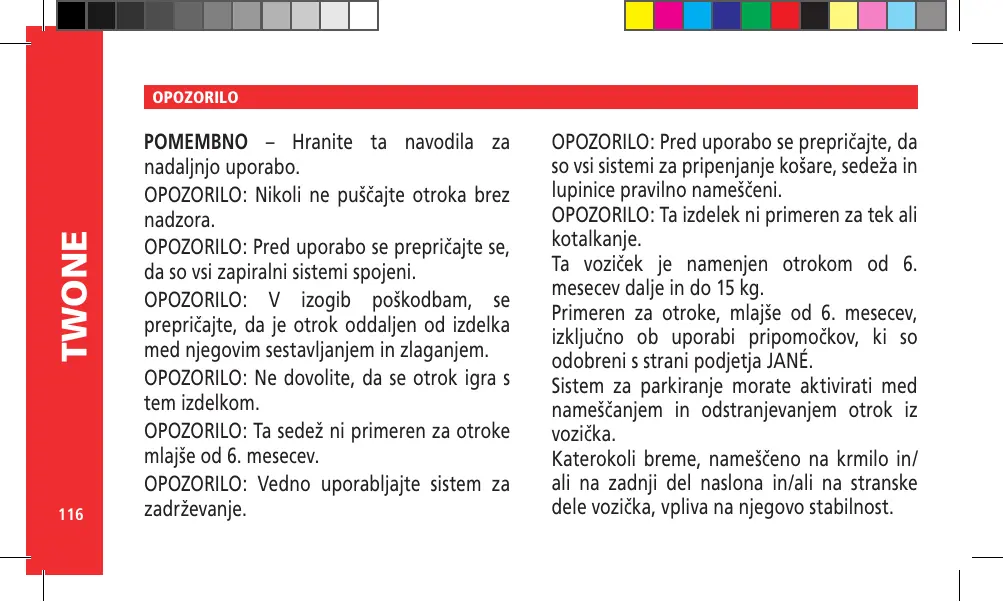 AVERTISSEMENT Ce produit ne convient pas pour faire du jogging ou des promenades en rollers. Ce véhicule est conçu pour des enfants âgés de 6 mois à 15 kg. Utilisable pour des enfants de moins de 6 mois uniquement avec des accessoires approuves par JANÉ Le dispositif de stationnement doit être activé pour installer ou retirer les enfants du véhicule. Une charge quelconque suspendue au gui-