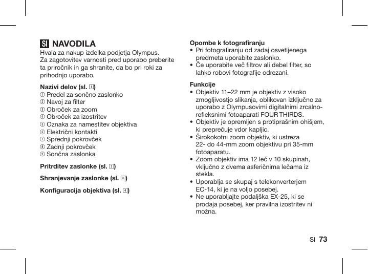 ZUIKO DIGITAL 11-22 MM 1:2.8-3.5 - Fotografski objektiv OLYMPUS - Notice d'utilisation et mode d'emploi gratuit