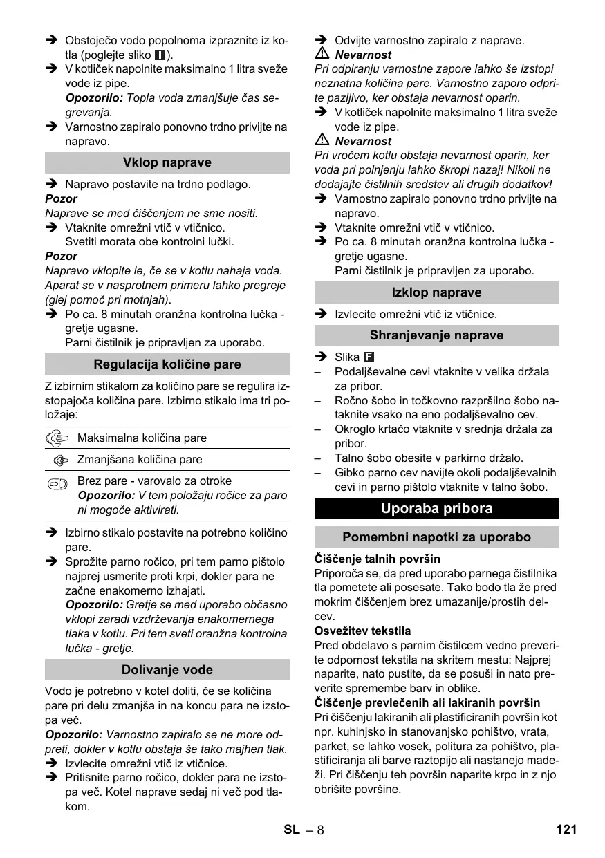 Embalažo je mogoče reciklirati. Prosimo, da embalaže ne odlagate med gospodinjski odpad, pač pa jo oddajte v ponovno predelavo. Stare naprave vsebujejo pomembne materiale, ki so namenjeni za nadaljnjo predelavo. Zato stare naprave zavrzite s pomočjo ustreznih zbiralnih sistemov. Opozorila k sestavinam (REACH) Aktualne informacije o sestavinah najdete na: www.kaercher.com/REACH Splošna navodila Dobavni obseg Spoštovani kupec, Pred prvo uporabo Vaše naprave preberite to originalno navodilo za uporabo, ravnajte se po njem in shranite ga za morebitno kasnejšo uporabo ali za naslednjega lastnika. Obseg dobave Vaše naprave je prikazan na embalaži. Pri jemanju stroja iz embalaže preverite popolnost vsebine. Pri manjkajočem priboru ali transportnih škodah obvestite Vašega prodajalca. Namenska uporaba Parni čistilnik uporabljajte izključno za privatno gospodinjstvo. Naprava je namenjena čiščenju s paro in se lahko uporablja z ustreznim priborom, kot je opisano v tem navodilu za uporabo. Čistilno sredstvo ni potrebno. Pri tem še posebej upoštevajte varnostna opozorila. Simboli v navodilu za uporabo Nevarnost Za neposredno grozečo nevarnost, ki vodi do težkih telesnih poškodb ali smrti. 몇 Opozorilo Za možno nevarno situacijo, ki bi lahko vodila do težkih telesnih poškodb ali smrti. Pozor Za možno nevarno situacijo, ki lahko vodi do lahkih poškodb ali materialne škode. Simboli na napravi Para POZOR - nevarnost opeklin