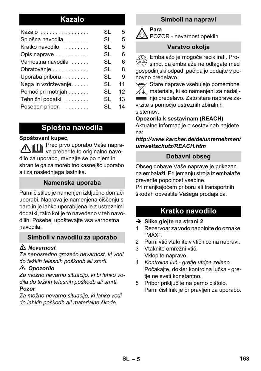 Splošna navodila Spoštovani kupec, Pred prvo uporabo Vaše naprave preberite to originalno navodilo za uporabo, ravnajte se po njem in shranite ga za morebitno kasnejšo uporabo ali za naslednjega lastnika. Namenska uporaba Parni čistilec je namenjen izključno domači uporabi. Naprava je namenjena čiščenju s paro in je lahko uporabljena le z ustreznimi dodatki, tako kot je to navedeno v teh navodilih. Posebej upoštevajte vsa varnostna navodila. Simboli v navodilu za uporabo Nevarnost Za neposredno grozečo nevarnost, ki vodi do težkih telesnih poškodb ali smrti. 몇 Opozorilo Za možno nevarno situacijo, ki bi lahko vodila do težkih telesnih poškodb ali smrti. Pozor Za možno nevarno situacijo, ki lahko vodi do lahkih poškodb ali materialne škode. Para POZOR - nevarnost opeklin Varstvo okolja Embalažo je mogoče reciklirati. Prosimo, da embalaže ne odlagate med gospodinjski odpad, pač pa jo oddajte v ponovno predelavo. Stare naprave vsebujejo pomembne materiale, ki so namenjeni za nadaljnjo predelavo. Zato stare naprave zavrzite s pomočjo ustreznih zbiralnih sistemov. Opozorila k sestavinam (REACH) Aktualne informacije o sestavinah najdete na: http://www.karcher.de/de/unternehmen/ umweltschutz/REACH.htm Dobavni obseg Obseg dobave Vaše naprave je prikazan na embalaži. Pri jemanju stroja iz embalaže preverite popolnost vsebine. Pri manjkajočem priboru ali transportnih škodah obvestite Vašega prodajalca. Kratko navodilo Î Slike glejte na strani 2 1 Rezervoar za vodo napolnite do oznake "MAX". 2 Parni vtič vtaknite v vtičnico na napravi. 3 Vtaknite omrežni vtič. Vklopite napravo. 4 Kontrolna luč - gretje utripa zeleno. Počakajte, dokler kontrolna lučka - gretje ne sveti konstantno. 5 Pribor priključite na parno pištolo. Parni čistilnik je pripravljen za uporabo. SL – 5