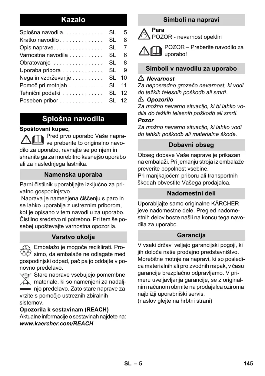 Splošna navodila Spoštovani kupec, Pred prvo uporabo Vaše naprave preberite to originalno navodilo za uporabo, ravnajte se po njem in shranite ga za morebitno kasnejšo uporabo ali za naslednjega lastnika. Namenska uporaba Parni čistilnik uporabljajte izključno za privatno gospodinjstvo. Naprava je namenjena čiščenju s paro in se lahko uporablja z ustreznim priborom, kot je opisano v tem navodilu za uporabo. Čistilno sredstvo ni potrebno. Pri tem še posebej upoštevajte varnostna opozorila. Para POZOR - nevarnost opeklin POZOR – Preberite navodilo za uporabo! Simboli v navodilu za uporabo Nevarnost Za neposredno grozečo nevarnost, ki vodi do težkih telesnih poškodb ali smrti. 몇 Opozorilo Za možno nevarno situacijo, ki bi lahko vodila do težkih telesnih poškodb ali smrti. Pozor Za možno nevarno situacijo, ki lahko vodi do lahkih poškodb ali materialne škode. Dobavni obseg Obseg dobave Vaše naprave je prikazan na embalaži. Pri jemanju stroja iz embalaže preverite popolnost vsebine. Pri manjkajočem priboru ali transportnih škodah obvestite Vašega prodajalca. Nadomestni deli Uporabljajte samo originalne KÄRCHER jeve nadomestne dele. Pregled nadomestnih delov boste našli na koncu tega navodila za uporabo. Varstvo okolja Garancija Embalažo je mogoče reciklirati. Prosimo, da embalaže ne odlagate med gospodinjski odpad, pač pa jo oddajte v ponovno predelavo. Stare naprave vsebujejo pomembne materiale, ki so namenjeni za nadaljnjo predelavo. Zato stare naprave zavrzite s pomočjo ustreznih zbiralnih sistemov. Opozorila k sestavinam (REACH) Aktualne informacije o sestavinah najdete na: www.kaercher.com/REACH V vsaki državi veljajo garancijski pogoji, ki jih določa naše prodajno predstavništvo. Morebitne motnje na napravi, ki so posledica materialnih ali proizvodnih napak, v času garancije brezplačno odpravljamo. V primeru uveljavljanja garancije, se z originalnim računom obrnite na prodajalca oziroma najbližji uporabniški servis. (naslov glejte na hrbtni strani) SL – 5