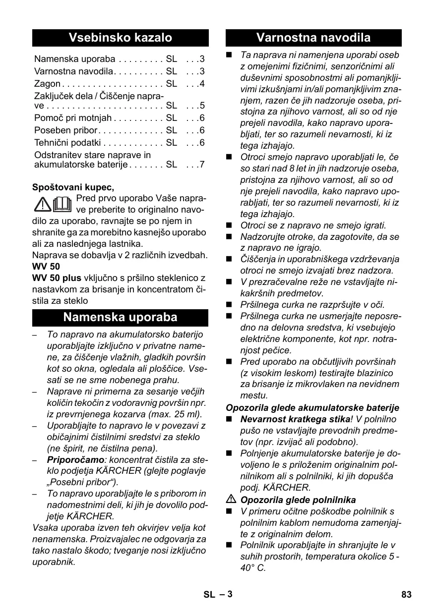 Spoštovani kupec, Pred prvo uporabo Vaše naprave preberite to originalno navodilo za uporabo, ravnajte se po njem in shranite ga za morebitno kasnejšo uporabo ali za naslednjega lastnika. Naprava se dobavlja v 2 različnih izvedbah. WV 50 WV 50 plus vključno s pršilno steklenico z nastavkom za brisanje in koncentratom čistila za steklo Namenska uporaba To napravo na akumulatorsko baterijo uporabljajte izključno v privatne namene, za čiščenje vlažnih, gladkih površin kot so okna, ogledala ali ploščice. Vsesati se ne sme nobenega prahu. – Naprave ni primerna za sesanje večjih količin tekočin z vodoravnig površin npr. iz prevrnjenega kozarva (max. 25 ml). – Uporabljajte to napravo le v povezavi z običajnimi čistilnimi sredstvi za steklo (ne špirit, ne čistilna pena). – Priporočamo: koncentrat čistila za steklo podjetja KÄRCHER (glejte poglavje „Posebni pribor“). – To napravo uporabljajte le s priborom in nadomestnimi deli, ki jih je dovolilo podjetje KÄRCHER. Vsaka uporaba izven teh okvirjev velja kot nenamenska. Proizvajalec ne odgovarja za tako nastalo škodo; tveganje nosi izključno uporabnik.