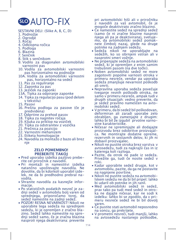 • Lire attentivement et intégralement la notice d’instructions avant de se servir du produit. • Pour le montage et l’installation du produit, suivre scrupuleusement les instructions. Ne laisser personne se servir du produit avant d’avoir lu les instructions. • Conserver cette notice pour toute consultation future. • Les statistiques des accidents montrent que le siège arrière des voitures est plus sûr que celui de devant et doit donc être préféré pour l’installation du siège auto. • ATTENTION ! DANGER GRAVE ! Ne jamais se servir de ce siège auto sur un siège avant muni d’un airbag frontal. On ne peut installer le siège auto sur le siège avant de la voiture que si l’airbag frontal a été désactivé : vérifier avec le constructeur automobile ou sur la notice d’instructions de la voiture s’il est possible de 15