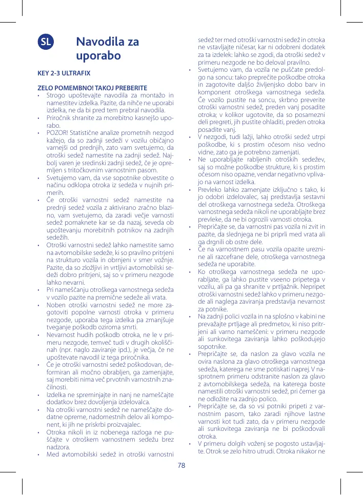 sedež ter med otroški varnostni sedež in otroka ne vstavljajte ničesar, kar ni odobreni dodatek za ta izdelek: lahko se zgodi, da otroški sedež v primeru nezgode ne bo deloval pravilno. Svetujemo vam, da vozila ne puščate predolgo na soncu: tako preprečite poškodbe otroka in zagotovite daljšo življenjsko dobo barv in komponent otroškega varnostnega sedeža. Če vozilo pustite na soncu, skrbno preverite otroški varnostni sedež, preden vanj posadite otroka; v kolikor ugotovite, da so posamezni deli pregreti, jih pustite ohladiti, preden otroka posadite vanj. V nezgodi, tudi lažji, lahko otroški sedež utrpi poškodbe, ki s prostim očesom niso vedno vidne, zato ga je potrebno zamenjati. Ne uporabljajte rabljenih otroških sedežev, saj so možne poškodbe strukture, ki s prostim očesom niso opazne, vendar negativno vplivajo na varnost izdelka. Prevleko lahko zamenjate izključno s tako, ki jo odobri izdelovalec, saj predstavlja sestavni del otroškega varnostnega sedeža. Otroškega varnostnega sedeža nikoli ne uporabljajte brez prevleke, da ne bi ogrozili varnosti otroka. Prepričajte se, da varnostni pas vozila ni zvit in pazite, da slednjega ne bi priprli med vrata ali ga drgnili ob ostre dele. Če na varnostnem pasu vozila opazite ureznine ali razcefrane dele, otroškega varnostnega sedeža ne uporabite. Ko otroškega varnostnega sedeža ne uporabljate, ga lahko pustite vseeno pripetega v vozilu, ali pa ga shranite v prtljažnik. Nepripet otroški varnostni sedež lahko v primeru nezgode ali naglega zaviranja predstavlja nevarnost za potnike. Na zadnji polici vozila in na splošno v kabini ne prevažajte prtljage ali predmetov, ki niso pritrjeni ali varno nameščeni: v primeru nezgode ali sunkovitega zaviranja lahko poškodujejo sopotnike. Prepričajte se, da naslon za glavo vozila ne ovira naslona za glavo otroškega varnostnega sedeža, katerega ne sme potiskati naprej. V nasprotnem primeru odstranite naslon za glavo z avtomobilskega sedeža, na katerega boste namestili otroški varnostni sedež, pri čemer ga ne odložite na zadnjo polico. Prepričajte se, da so vsi potniki pripeti z varnostnim pasom, tako zaradi njihove lastne varnosti kot tudi zato, da v primeru nezgode ali sunkovitega zaviranja ne bi poškodovali otroka. V primeru dolgih voženj se pogosto ustavljajte. Otrok se zelo hitro utrudi. Otroka nikakor ne