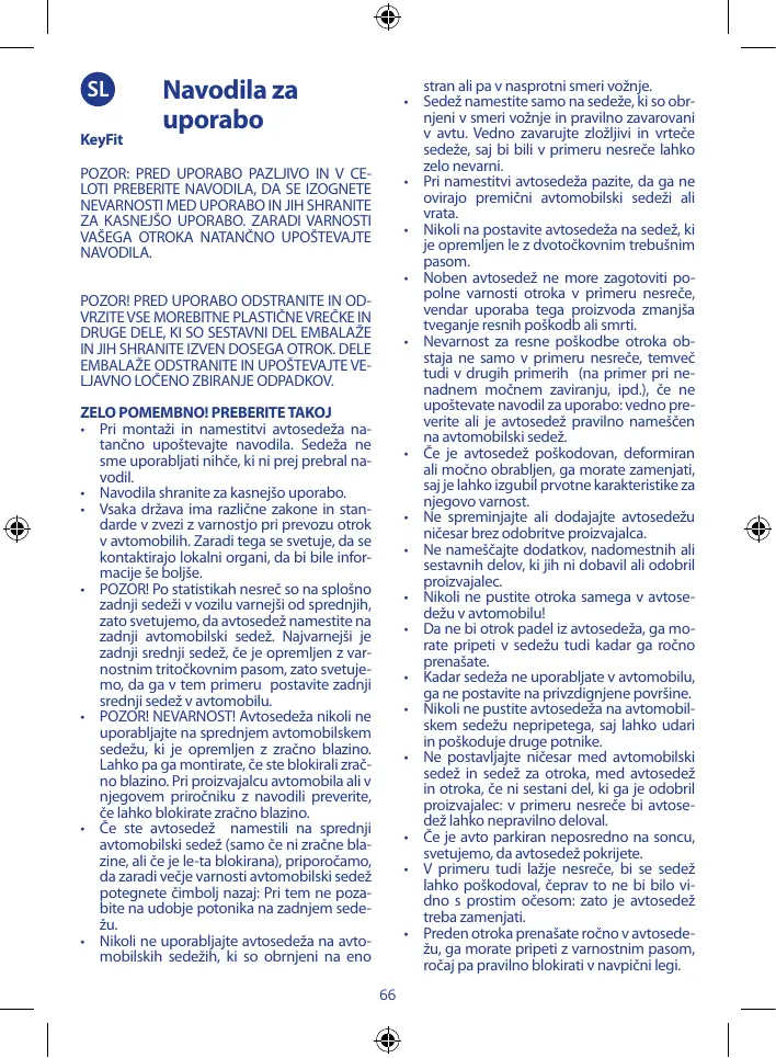 Stran ali pa v nasprotni smeri voänje. Sedez namestite samo na sedee, ki so obr- njeni v smeri voänje in pravilno zavarovani V avtu. Vedno zavaruite zloäljvi in vrteée sedeze, saj bi bili v primeru nesreée lahko zelo nevarni. Pri namestitvi avtosedeZa pazite, da ga ne ovirajo premiéni avtomobilski sedeäi ali vrata. Nikoli na postavite avtosedeZa na sede, ki je opremijen le z dvotoëkounim trebuënim pasom. Noben avtosedez ne more zagotoviti po- polne vamosti otroka v primeru nesreée, vendar uporaba tega proizvoda zmanjsa tveganje resnih poskodb ali smrti. Nevarnost za resne poëkodbe otroka ob- staja ne samo v primeru nesrece, temveé tudi v drugih primerih {na primer pri ne- nadnem moënem zaviranju, ipd), ée ne upoëtevate navodil za uporabo: vedno pre- verite ali je avtosedez pravilno nameséen na avtomobilski sedez. Ce je avtosedez poëkodovan, deformiran ali moëno obrabljen, ga morate zamenjati, saj je lahko izgubil prvotne karakteristike za njegovo vamost. Ne spreminjajte ali dodajajte avtosedezu niéesar brez odobritve proizvajalca Ne name$éajte dodatkov, nadomestnih ali sestavnih delov, ki jh ni dobavi ali odobril proivalec