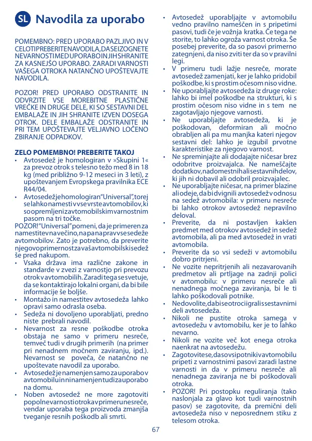 • No permita que nadie utilice el producto sin haber leído las instrucciones. • Si no se siguen exactamente las instrucciones de este manual aumenta el riesgo de daños graves para el niño, no sólo en caso de accidente sino también en otras situaciones (por ej. frenadas bruscas, etc.). • Este producto debe ser utilizado exclusivamente como sillita de automóvil; no utili28