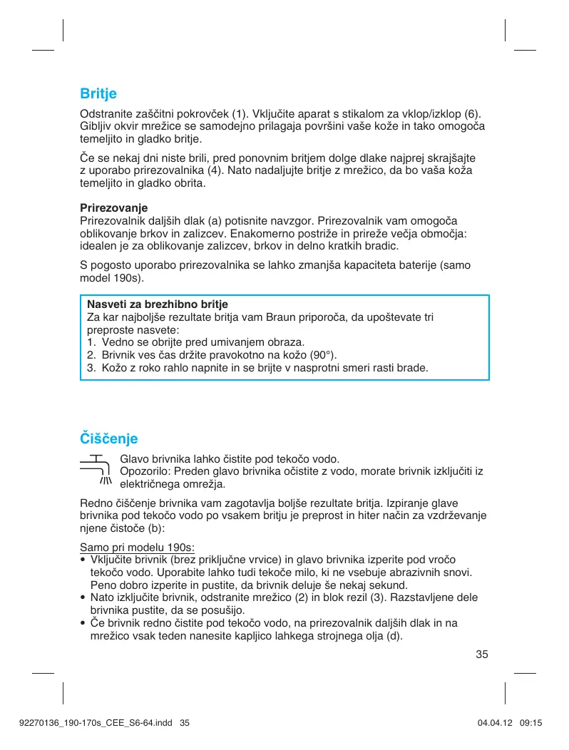 Britje Odstranite za‰ãitni pokrovãek (1). Vkljuãite aparat s stikalom za vklop/izklop (6). Gibljiv okvir mreÏice se samodejno prilagaja povr‰ini va‰e koÏe in tako omogoãa temeljito in gladko britje. âe se nekaj dni niste brili, pred ponovnim britjem dolge dlake najprej skraj‰ajte z uporabo prirezovalnika (4). Nato nadaljujte britje z mreÏico, da bo va‰a koÏa temeljito in gladko obrita. Prirezovanje Prirezovalnik dalj‰ih dlak (a) potisnite navzgor. Prirezovalnik vam omogoãa oblikovanje brkov in zalizcev. Enakomerno postriÏe in prireÏe veãja obmoãja: idealen je za oblikovanje zalizcev, brkov in delno kratkih bradic. S pogosto uporabo prirezovalnika se lahko zmanj‰a kapaciteta baterije (samo model 190s). Nasveti za brezhibno britje Za kar najboljše rezultate britja vam Braun priporoča, da upoštevate tri preproste nasvete: