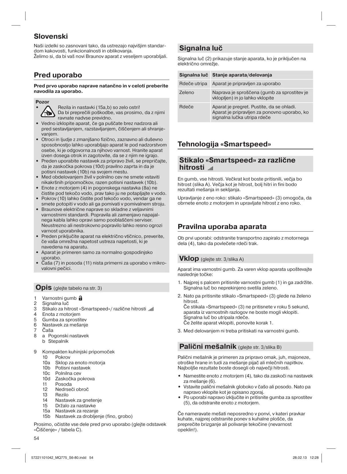 Rezila in nastavki (15a,b) so zelo ostri! Da bi preprečili poškodbe, vas prosimo, da z njimi ravnate nadvse previdno. Vedno izklopite aparat, če ga puščate brez nadzora ali pred sestavljanjem, razstavljanjem, čiščenjem ali shranjevanjem. Otroci in ljudje z zmanjšano fizično, zaznavno ali duševno sposobnostjo lahko uporabljajo aparat le pod nadzorstvom osebe, ki je odgovorna za njihovo varnost. Hranite aparat izven dosega otrok in zagotovite, da se z njim ne igrajo. Preden uporabite nastavek za pripravo živil, se prepričajte, da je zaskočka pokrova (10d) pravilno zaprta in da je potisni nastavek (10b) na svojem mestu. Med obdelovanjem živil v polnilno cev ne smete vstaviti nikakršnih pripomočkov, razen potisni nastavek (10b). Enote z motorjem (4) in pogonskega nastavka (8a) ne čistite pod tekočo vodo, prav tako ju ne potapljajte v vodo. Pokrov (10) lahko čistite pod tekočo vodo, vendar ga ne smete potopiti v vodo ali ga pomivati v pomivalnem stroju. Braunove električne naprave so skladne z veljavnimi varnostnimi standardi. Popravila ali zamenjavo napajalnega kabla lahko opravi samo pooblaščeni serviser. Neustrezno ali nestrokovno popravilo lahko resno ogrozi varnost uporabnika. Preden priključite aparat na električno vtičnico, preverite, če vaša omrežna napetost ustreza napetosti, ki je navedena na aparatu. Aparat je primeren samo za normalno gospodinjsko uporabo. Čaša (7) in posoda (11) nista primerni za uporabo v mikrovalovni pečici. Opis (glejte tabelo na str. 3)
