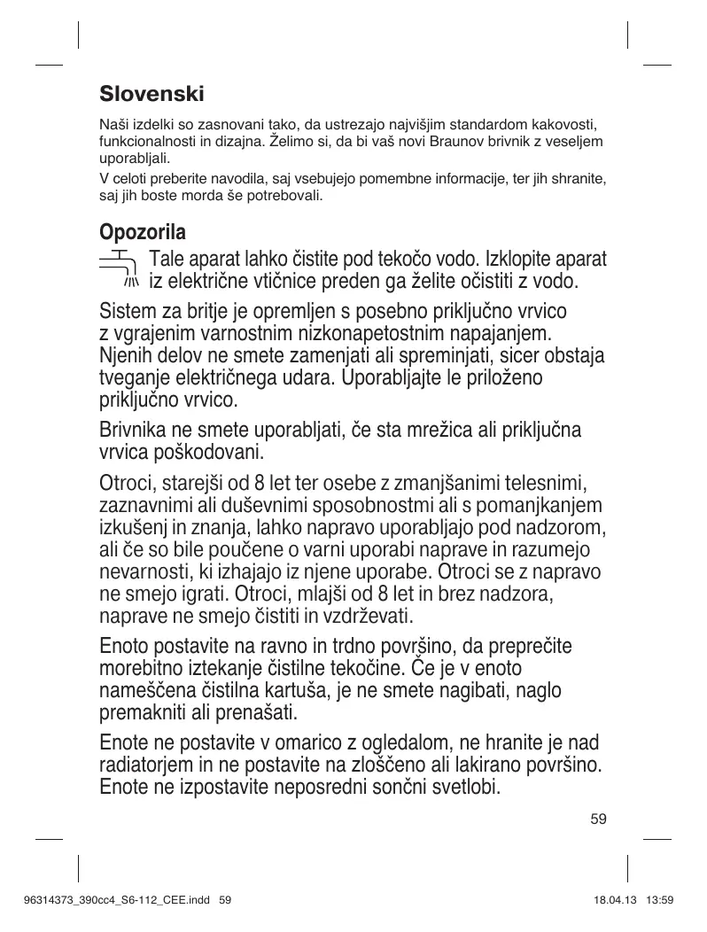Slovenski Naši izdelki so zasnovani tako, da ustrezajo najvišjim standardom kakovosti, funkcionalnosti in dizajna. Želimo si, da bi vaš novi Braunov brivnik z veseljem uporabljali. V celoti preberite navodila, saj vsebujejo pomembne informacije, ter jih shranite, saj jih boste morda še potrebovali. Opozorila Tale aparat lahko čistite pod tekočo vodo. Izklopite aparat iz električne vtičnice preden ga želite očistiti z vodo. Sistem za britje je opremljen s posebno priključno vrvico z vgrajenim varnostnim nizkonapetostnim napajanjem. Njenih delov ne smete zamenjati ali spreminjati, sicer obstaja tveganje električnega udara. Uporabljajte le priloženo priključno vrvico. Brivnika ne smete uporabljati, če sta mrežica ali priključna vrvica poškodovani. Otroci, starejši od 8 let ter osebe z zmanjšanimi telesnimi, zaznavnimi ali duševnimi sposobnostmi ali s pomanjkanjem izkušenj in znanja, lahko napravo uporabljajo pod nadzorom, ali če so bile poučene o varni uporabi naprave in razumejo nevarnosti, ki izhajajo iz njene uporabe. Otroci se z napravo ne smejo igrati. Otroci, mlajši od 8 let in brez nadzora, naprave ne smejo čistiti in vzdrževati. Enoto postavite na ravno in trdno površino, da preprečite morebitno iztekanje čistilne tekočine. Če je v enoto nameščena čistilna kartuša, je ne smete nagibati, naglo premakniti ali prenašati. Enote ne postavite v omarico z ogledalom, ne hranite je nad radiatorjem in ne postavite na zloščeno ali lakirano površino. Enote ne izpostavite neposredni sončni svetlobi.