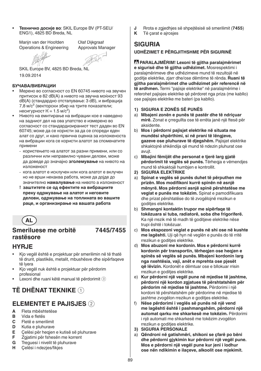 • -- éliminez les poussières de ponçage qui adhèrent à l'outil avec un pinceau !! débranchez la fiche avant le nettoyage Si, malgré tous les soins apportés à la fabrication et au contrôle de l’outil, celui ci devait avoir un défaut, la réparation ne doit être confiée qu’à une station de service après-vente agréée pour outillage SKIL -- retournez l’outil non démonté avec votre preuve d’achat au revendeur ou au centre de service aprèsvente SKIL le plus proche (les adresses ainsi que la vue éclatée de l’outil figurent sur www.skil.com)