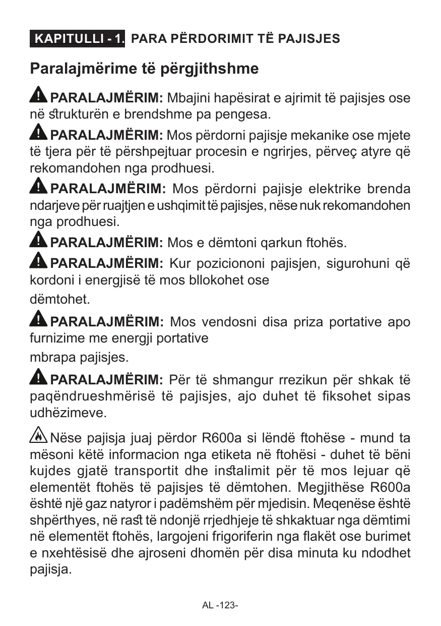 AL -122- KAPITULLI - 1. PARA PËRDORIMIT TË PAJISJES Paralajmërime të përgjithshme PARALAJMËRIM: Mbajini hapësirat e ajrimit të pajisjes ose në strukturën e brendshme pa pengesa. PARALAJMËRIM: Mos përdorni pajisje mekanike ose mjete të tjera për të përshpejtuar procesin e ngrirjes, përveç atyre që rekomandohen nga prodhuesi. PARALAJMËRIM: Mos përdorni pajisje elektrike brenda ndarjeve për ruajtjen e ushqimit të pajisjes, nëse nuk rekomandohen nga prodhuesi. PARALAJMËRIM: Mos e dëmtoni qarkun ftohës. PARALAJMËRIM: Kur poziciononi pajisjen, sigurohuni që kordoni i energjisë të mos bllokohet ose dëmtohet. PARALAJMËRIM: Mos vendosni disa priza portative apo furnizime me energji portative mbrapa pajisjes. PARALAJMËRIM: Për të shmangur rrezikun për shkak të paqëndrueshmërisë të pajisjes, ajo duhet të fiksohet sipas udhëzimeve. Nëse pajisja juaj përdor R600a si lëndë ftohëse - mund ta mësoni këtë informacion nga etiketa në ftohësi - duhet të bëni kujdes gjatë transportit dhe instalimit për të mos lejuar që elementët ftohës të pajisjes të dëmtohen. Megjithëse R600a është një gaz natyror i padëmshëm për mjedisin. Meqenëse është shpërthyes, në rast të ndonjë rrjedhjeje të shkaktuar nga dëmtimi në elementët ftohës, largojeni frigoriferin nga flakët ose burimet e nxehtësisë dhe ajroseni dhomën për disa minuta ku ndodhet pajisja. AL -123-