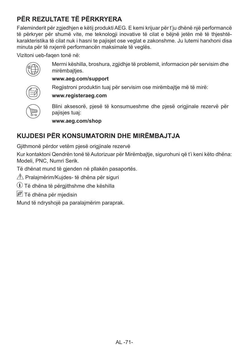 Faleminderit për zgjedhjen e këtij produkti AEG. E kemi krijuar për t’ju dhënë një performancë të përkryer për shumë vite, me teknologji inovative të cilat e bëjnë jetën më të thjeshtëkarakteristika të cilat nuk i hasni te pajisjet ose veglat e zakonshme. Ju lutemi harxhoni disa minuta për të nxjerrë performancën maksimale të veglës. Vizitoni ueb-faqen tonë në: Merrni këshilla, broshura, zgjidhje të problemit, informacion për servisim dhe mirëmbajtjes. www.aeg.com/support Regjistroni produktin tuaj për servisim ose mirëmbajtje më të mirë: www.registeraeg.com Blini aksesorë, pjesë të konsumueshme dhe pjesë origjinale rezervë për pajisjes tuaj: www.aeg.com/shop KUJDESI PËR KONSUMATORIN DHE MIRËMBAJTJA Gjithmonë përdor vetëm pjesë origjinale rezervë Kur kontaktoni Qendrën tonë të Autorizuar për Mirëmbajtje, sigurohuni që t’i keni këto dhëna: Modeli, PNC, Numri Serik. Të dhënat mund të gjenden në pllakën pasaportës. Pralajmërim/Kujdes- të dhëna për siguri Të dhëna të përgjithshme dhe këshilla Të dhëna për mjedisin Mund të ndryshojë pa paralajmërim paraprak. AL -71- KAPITULLI - 1. PARA PËRDORIMIT TË PAJISJES Paralajmërime të përgjithshme Ju lutemi lexoni me kujdes manualin e udhëzimeve para montimit dhe përdorimit të pajisjes. Ne nuk jemi përgjegjës për dëmtimet e shkaktuara nga keqpërdorimi. Ndiqni të gjitha udhëzimet në pajisje dhe në manualin e udhëzimeve dhe mbajeni manualin në një vend të sigurt për të zgjidhur problemet që mund të ndodhin në të ardhmen. Kjo pajisje nuk synon të përdoret si pajisje e integruar. Nëse, për shkak të instalimit të ndryshëm, nuk respektohen kërkesat për ventilimin, pajisja do të funksionojë mirë, por konsumi i energjisë mund të rritet pak. PARALAJMËRIM: Mbajini hapësirat e ajrimit të pajisjes ose në strukturën e brendshme pa pengesa. PARALAJMËRIM: Mos përdorni pajisje mekanike ose mjete të tjera për të përshpejtuar procesin e ngrirjes, përveç atyre që rekomandohen nga prodhuesi. PARALAJMËRIM: Mos përdorni pajisje elektrike brenda ndarjeve për ruajtjen e ushqimit të pajisjes, nëse nuk rekomandohen nga prodhuesi. PARALAJMËRIM: Mos e dëmtoni qarkun ftohës. PARALAJMËRIM: Kur poziciononi pajisjen, sigurohuni që kordoni i energjisë të mos bllokohet ose dëmtohet. PARALAJMËRIM: Mos vendosni disa priza portative apo furnizime me energji portative mbrapa pajisjes. PARALAJMËRIM: Për të shmangur rrezikun për shkak të paqëndrueshmërisë të pajisjes, ajo duhet të fiksohet sipas udhëzimeve. AL -72- Nëse pajisja juaj përdor R600a si lëndë ftohëse - mund ta mësoni këtë informacion nga etiketa në ftohësi - duhet të bëni kujdes gjatë transportit dhe instalimit për të mos lejuar që elementët ftohës të pajisjes të dëmtohen. Megjithëse R600a është një gaz natyror i padëmshëm për mjedisin. Meqenëse është shpërthyes, në rast të ndonjë rrjedhjeje të shkaktuar nga dëmtimi në elementët ftohës, largojeni frigoriferin nga flakët ose burimet e nxehtësisë dhe ajroseni dhomën për disa minuta ku ndodhet pajisja.