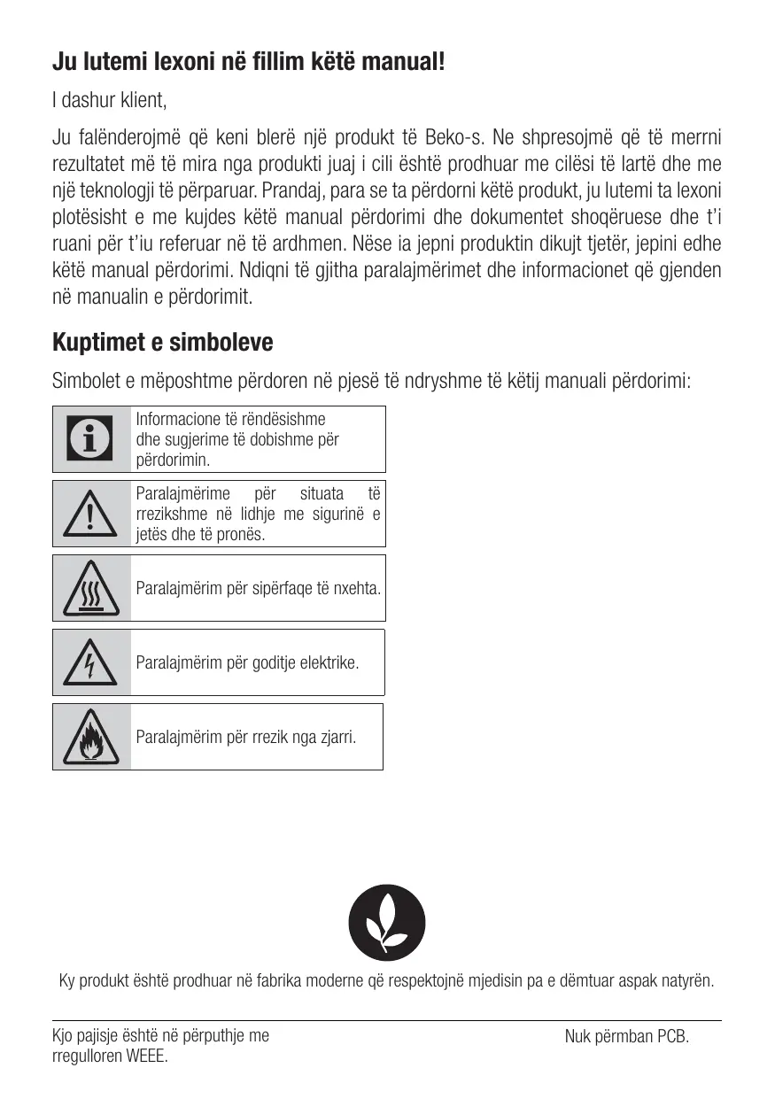 Ju lutemi lexoni në fillim këtë manual! I dashur klient, Ju falënderojmë që keni blerë një produkt të Beko-s. Ne shpresojmë që të merrni rezultatet më të mira nga produkti juaj i cili është prodhuar me cilësi të lartë dhe me një teknologji të përparuar. Prandaj, para se ta përdorni këtë produkt, ju lutemi ta lexoni plotësisht e me kujdes këtë manual përdorimi dhe dokumentet shoqëruese dhe t’i ruani për t’iu referuar në të ardhmen. Nëse ia jepni produktin dikujt tjetër, jepini edhe këtë manual përdorimi. Ndiqni të gjitha paralajmërimet dhe informacionet që gjenden në manualin e përdorimit.