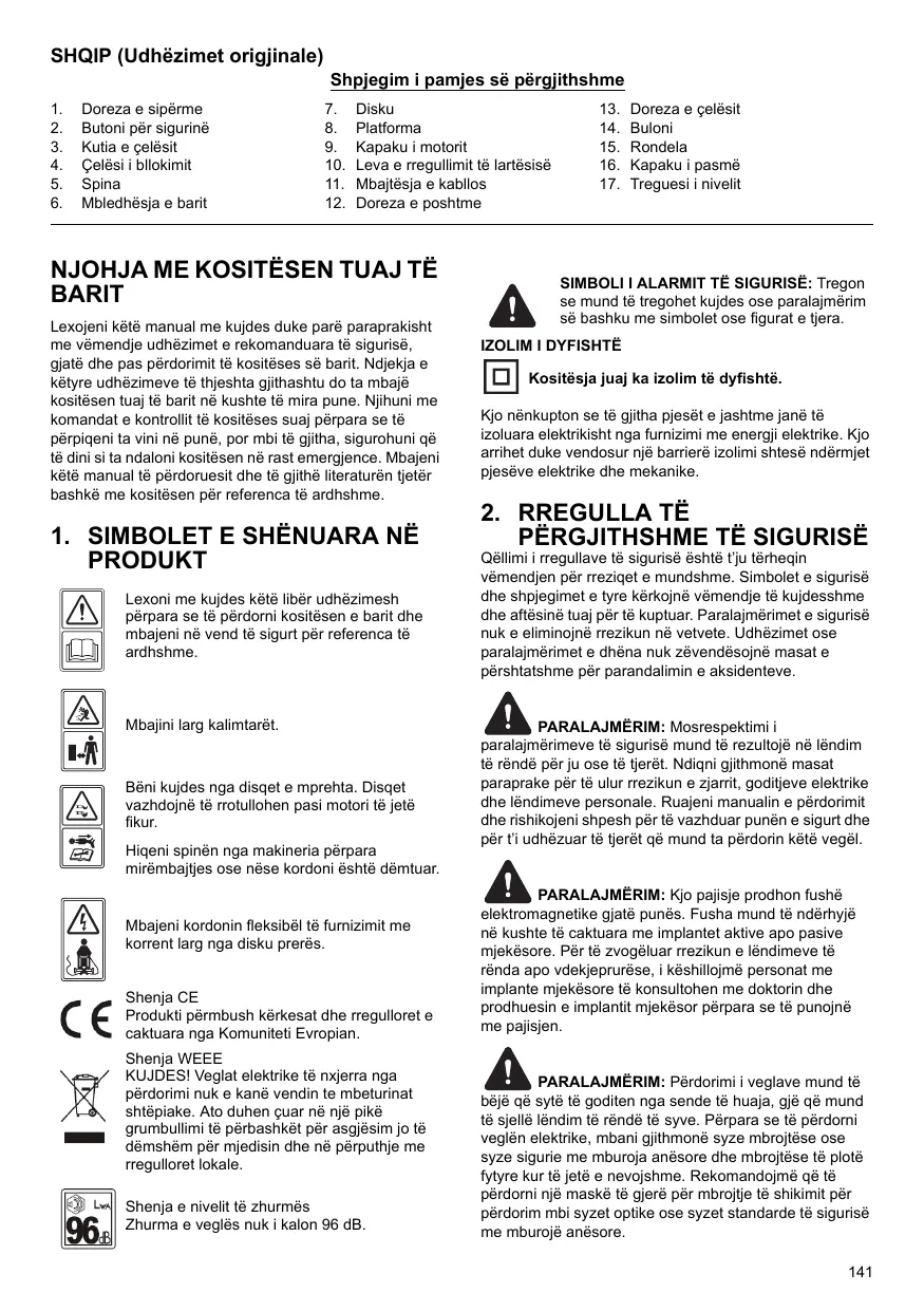 PRODUKT Lexoni me kujdes këtë libër udhëzimesh përpara se të përdorni kositësen e barit dhe mbajeni në vend të sigurt për referenca të ardhshme. Mbajini larg kalimtarët. Bëni kujdes nga disqet e mprehta. Disqet vazhdojnë të rrotullohen pasi motori të jetë fikur. Hiqeni spinën nga makineria përpara mirëmbajtjes ose nëse kordoni është dëmtuar. Mbajeni kordonin fleksibël të furnizimit me korrent larg nga disku prerës. Shenja CE Produkti përmbush kërkesat dhe rregulloret e caktuara nga Komuniteti Evropian. Shenja WEEE KUJDES! Veglat elektrike të nxjerra nga përdorimi nuk e kanë vendin te mbeturinat shtëpiake. Ato duhen çuar në një pikë grumbullimi të përbashkët për asgjësim jo të dëmshëm për mjedisin dhe në përputhje me rregulloret lokale. Shenja e nivelit të zhurmës Zhurma e veglës nuk i kalon 96 dB.