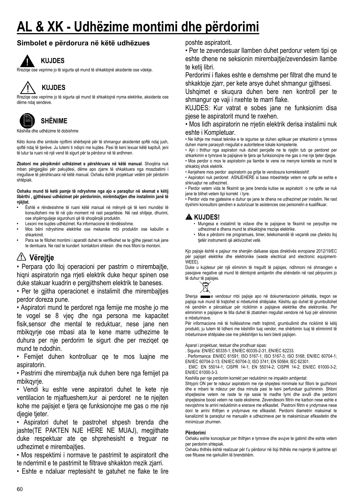 AL & XK - Udhëzime montimi dhe përdorimi Simbolet e përdorura në këtë udhëzues KUJDES Rreziqe ose veprime jo të sigurta që mund të shkaktojnë aksidente ose vdekje.