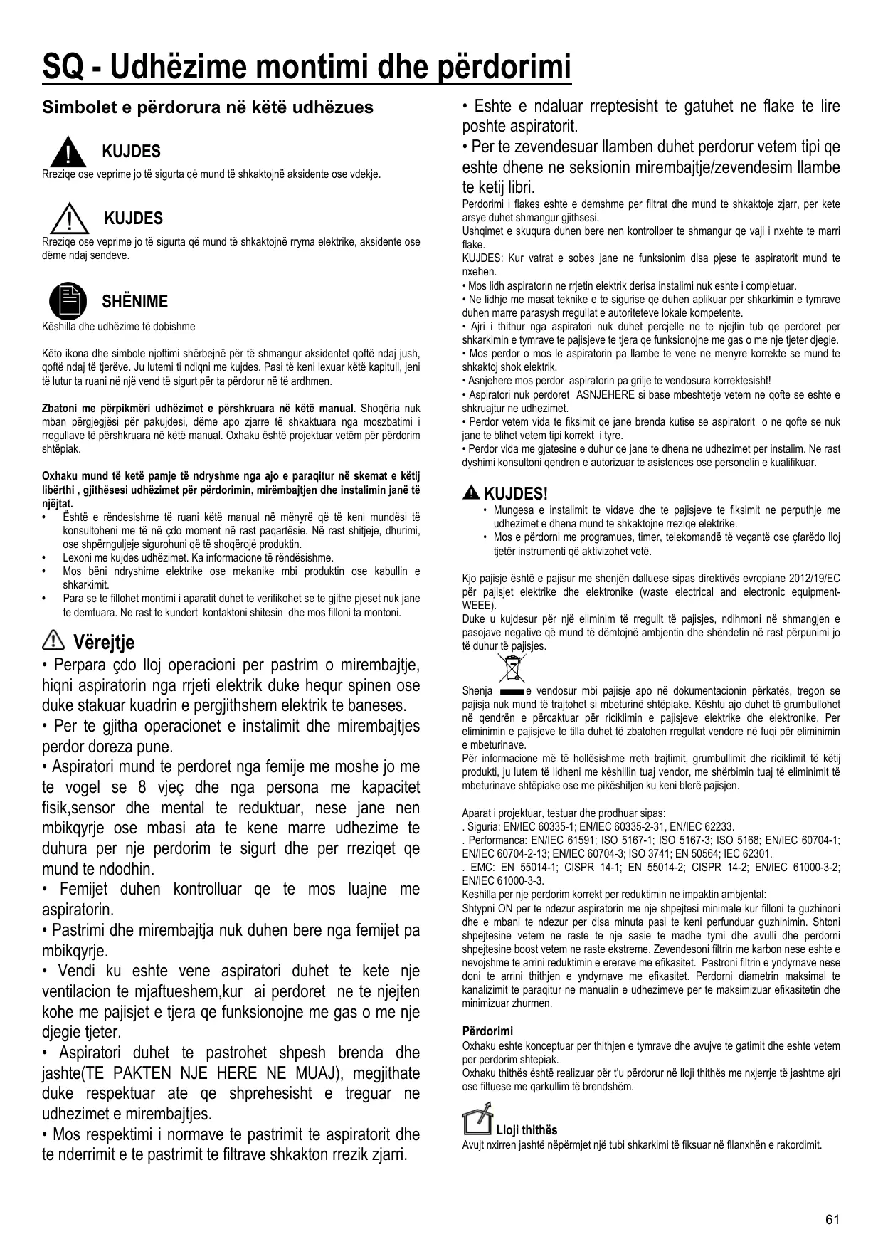 Shenja e vendosur mbi pajisje apo në dokumentacionin përkatës, tregon se pajisja nuk mund të trajtohet si mbeturinë shtëpiake. Kështu ajo duhet të grumbullohet në qendrën e përcaktuar për riciklimin e pajisjeve elektrike dhe elektronike. Per eliminimin e pajisjeve te tilla duhet të zbatohen rregullat vendore në fuqi për eliminimin e mbeturinave. Për informacione më të hollësishme rreth trajtimit, grumbullimit dhe riciklimit të këtij produkti, ju lutem të lidheni me këshillin tuaj vendor, me shërbimin tuaj të eliminimit të mbeturinave shtëpiake ose me pikëshitjen ku keni blerë pajisjen. Aparat i projektuar, testuar dhe prodhuar sipas: . Siguria: EN/IEC 60335-1; EN/IEC 60335-2-31, EN/IEC 62233. . Performanca: EN/IEC 61591; ISO 5167-1; ISO 5167-3; ISO 5168; EN/IEC 60704-1; EN/IEC 60704-2-13; EN/IEC 60704-3; ISO 3741; EN 50564; IEC 62301. . EMC: EN 55014-1; CISPR 14-1; EN 55014-2; CISPR 14-2; EN/IEC 61000-3-2; EN/IEC 61000-3-3. Keshilla per nje perdorim korrekt per reduktimin ne impaktin ambjental: Shtypni ON per te ndezur aspiratorin me nje shpejtesi minimale kur filloni te guzhinoni dhe e mbani te ndezur per disa minuta pasi te keni perfunduar guzhinimin. Shtoni shpejtesine vetem ne raste te nje sasie te madhe tymi dhe avulli dhe perdorni shpejtesine boost vetem ne raste ekstreme. Zevendesoni filtrin me karbon nese eshte e nevojshme te arrini reduktimin e ererave me efikasitet. Pastroni filtrin e yndyrnave nese doni te arrini thithjen e yndyrnave me efikasitet. Perdorni diametrin maksimal te kanalizimit te paraqitur ne manualin e udhezimeve per te maksimizuar efikasitetin dhe minimizuar zhurmen.