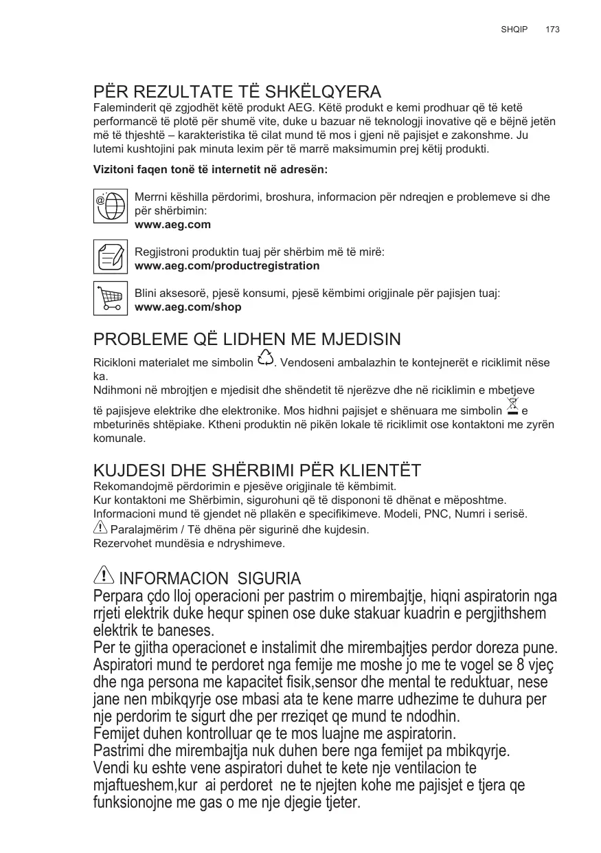 PËR REZULTATE TË SHKËLQYERA Faleminderit që zgjodhët këtë produkt AEG. Këtë produkt e kemi prodhuar që të ketë performancë të plotë për shumë vite, duke u bazuar në teknologji inovative që e bëjnë jetën më të thjeshtë – karakteristika të cilat mund të mos i gjeni në pajisjet e zakonshme. Ju lutemi kushtojini pak minuta lexim për të marrë maksimumin prej këtij produkti. Vizitoni faqen tonë të internetit në adresën: Merrni këshilla përdorimi, broshura, informacion për ndreqjen e problemeve si dhe për shërbimin: www.aeg.com Regjistroni produktin tuaj për shërbim më të mirë: www.aeg.com/productregistration Blini aksesorë, pjesë konsumi, pjesë këmbimi origjinale për pajisjen tuaj: www.aeg.com/shop