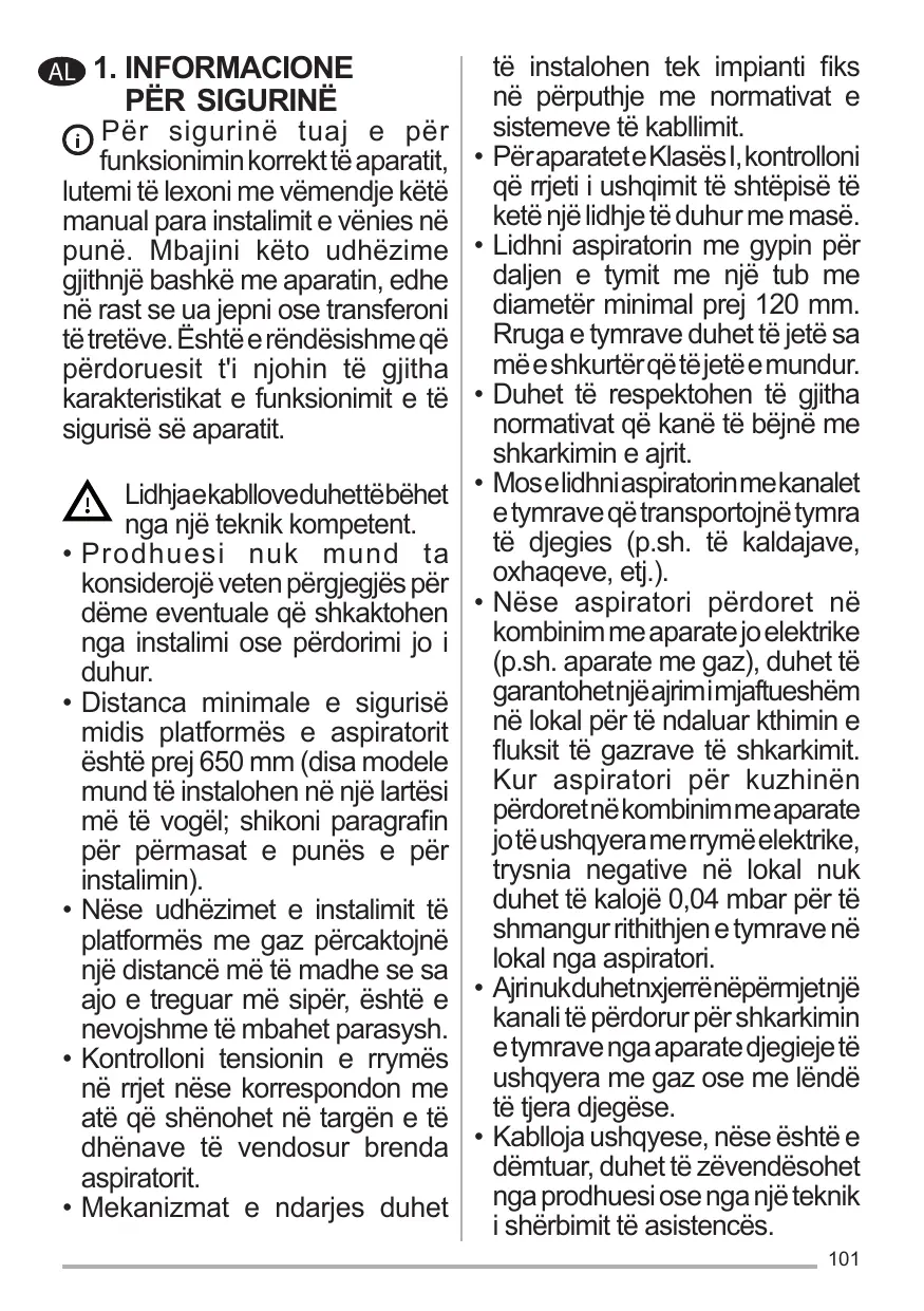 • De ruimte moet voldoende geventileerd zijn als de afzuigkap tegelijk met apparaten op gas of andere brandstoffen wordt gebruikt (niet van toepassing op