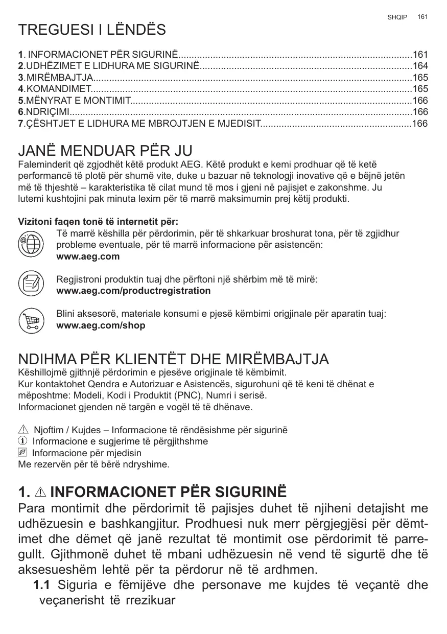 JANË MENDUAR PËR JU Faleminderit që zgjodhët këtë produkt AEG. Këtë produkt e kemi prodhuar që të ketë performancë të plotë për shumë vite, duke u bazuar në teknologji inovative që e bëjnë jetën më të thjeshtë – karakteristika të cilat mund të mos i gjeni në pajisjet e zakonshme. Ju lutemi kushtojini pak minuta lexim për të marrë maksimumin prej këtij produkti. Vizitoni faqen tonë të internetit për: Të marrë këshilla për përdorimin, për të shkarkuar broshurat tona, për të zgjidhur probleme eventuale, për të marrë informacione për asistencën: www.aeg.com Regjistroni produktin tuaj dhe përftoni një shërbim më të mirë: www.aeg.com/productregistration Blini aksesorë, materiale konsumi e pjesë këmbimi origjinale për aparatin tuaj: www.aeg.com/shop