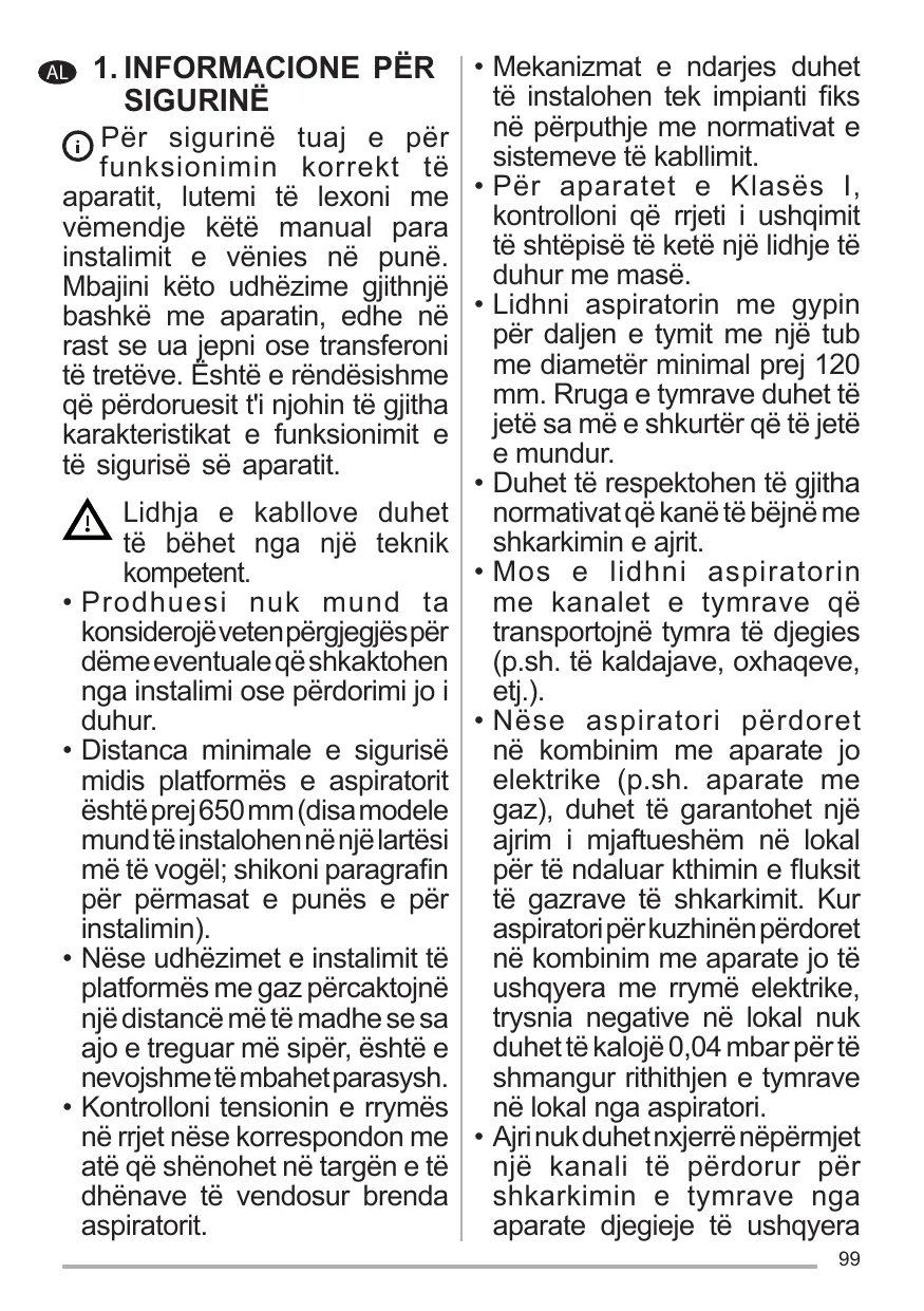 Les dispositifs de sectionnement doivent être montés dans l’installation fixe conformément aux normes sur les systèmes de câblage. Pour les appareils de Classe I, s’assurer que l’installation électrique de votre intérieur dispose d’une mise à la terre adéquate. Reliez l’aspirateur du conduit de cheminée avec un tube ayant un diamètre minimum de 120 mm. Le parcours des fumées doit être le plus court possible. Respecter toutes les normes concernant l’évacuation de l’air. Ne reliez pas la hotte aspirante aux conduits de cheminée qui acheminent les fumées de combustion (par ex. de chaudières, de cheminées, etc.). Si vous utilisez l’aspirateur en même temps que des appareils non électriques (par ex. fonctionnant au gaz), veillez à ce que la pièce soit adéquatement ventilée, afin d’empêcher le retour du flux des gaz d’évacuation. Si vous utilisez la hotte de cuisine en même temps que des appareils non alimentés à l’électricité, la pression négative dans la pièce ne doit pas dépasser 0,04 mbar, afin d’éviter que les fumées soient réaspirées dans la pièce où se trouve la hotte.