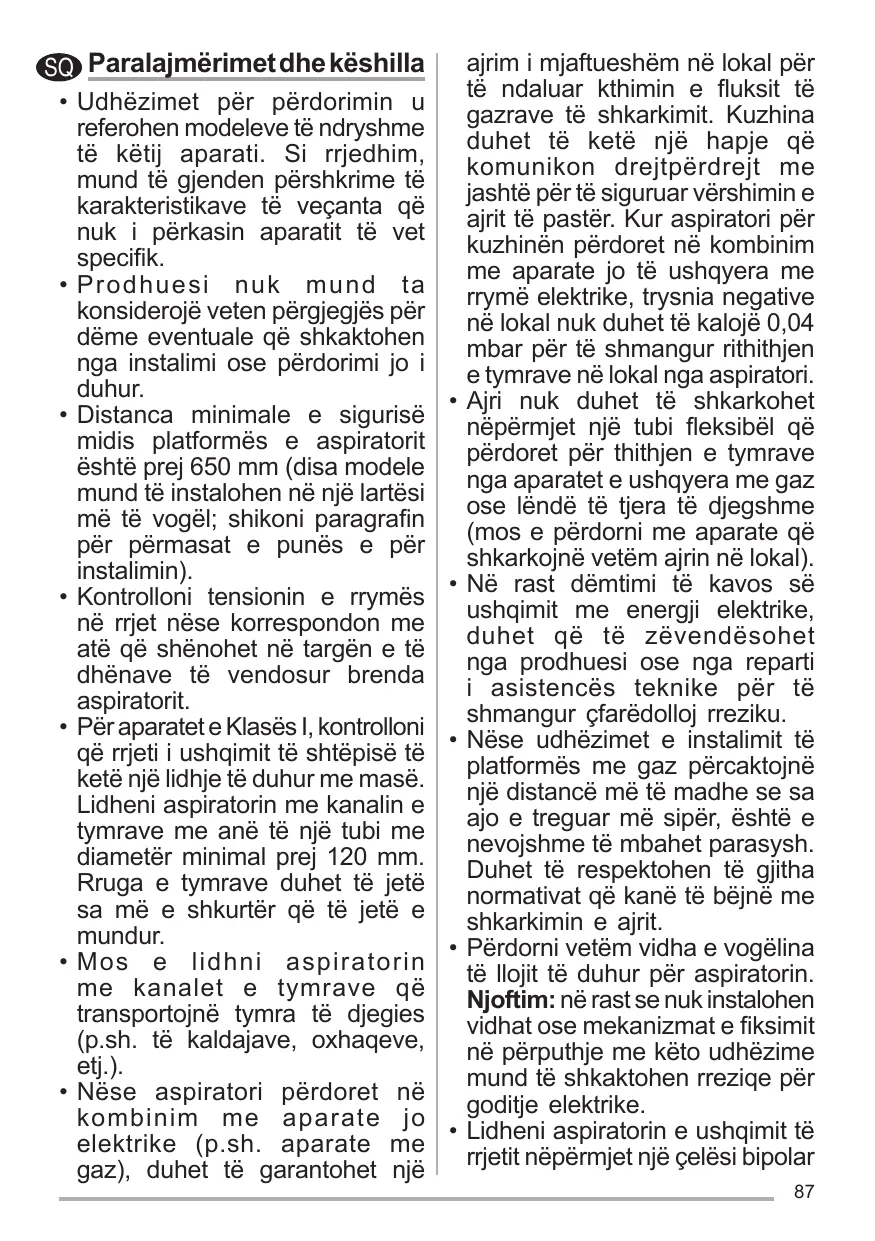 • Compruebe que la tensión de alimentación corresponda a la indicada en la placa de datos colocada en el interior de la campana. • Para los aparatos de Clase I, compruebe que la red eléctrica doméstica tenga una conexión a tierra adecuada. Conecte la campana extractora al conducto de humo a través de un tubo con un diámetro mínimo de 120 mm. La trayectoria del humo debe ser lo más corta posible. • No conecte la campana extractora a los conductos de humo que transportan humo de combustión (ej. calderas, chimeneas, etc.). • Si la campana extractora se utiliza en combinación con aparatos no eléctricos (por ejemplo, aparatos de gas), debe garantizarse