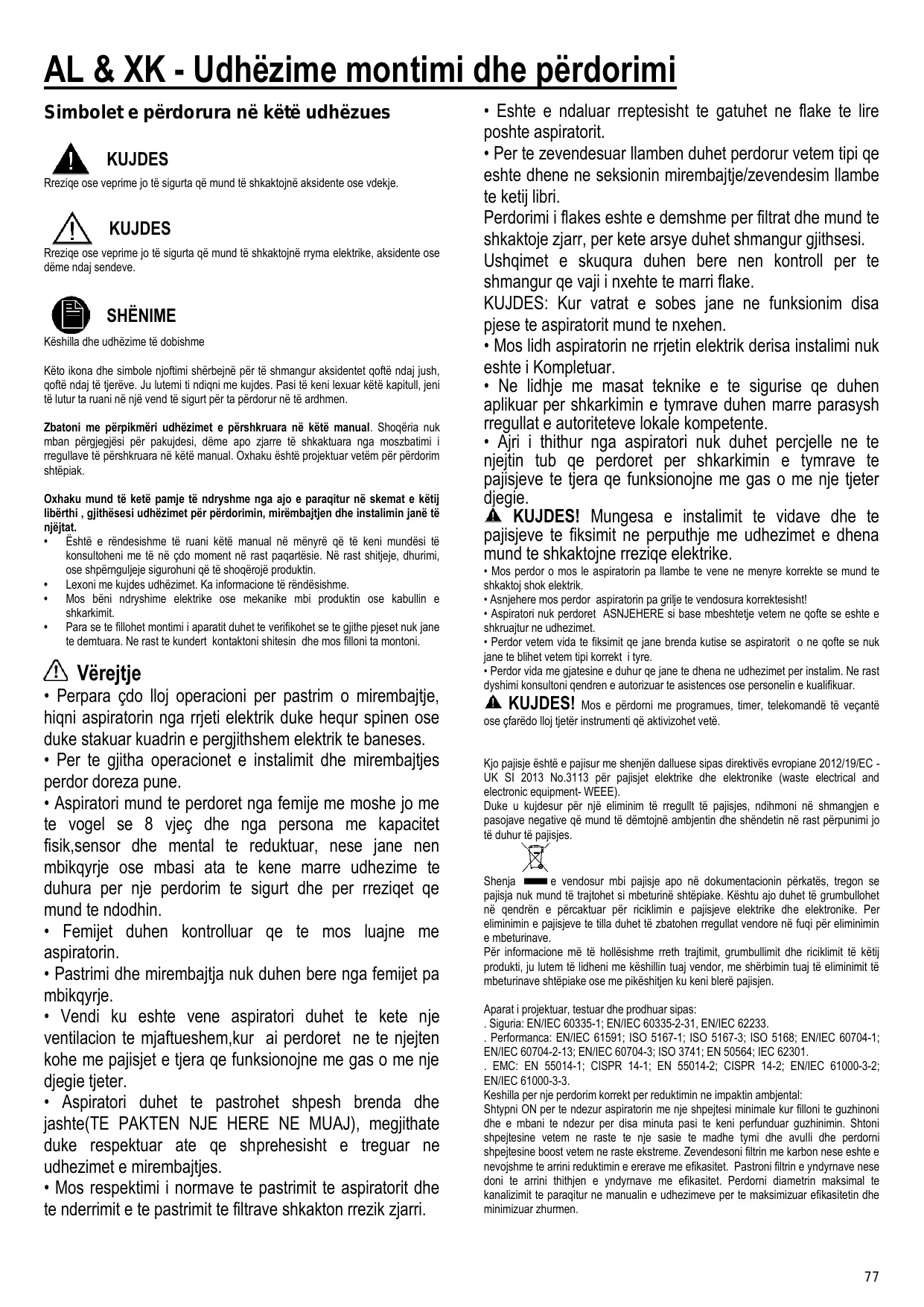AL & XK - Udhëzime montimi dhe përdorimi Simbolet e përdorura në këtë udhëzues KUJDES Rreziqe ose veprime jo të sigurta që mund të shkaktojnë aksidente ose vdekje.