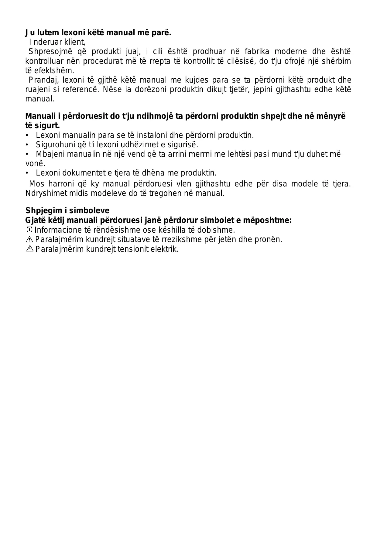 Ju lutem lexoni këtë manual më parë. I nderuar klient, Shpresojmë që produkti juaj, i cili është prodhuar në fabrika moderne dhe është kontrolluar nën procedurat më të rrepta të kontrollit të cilësisë, do t'ju ofrojë një shërbim të efektshëm. Prandaj, lexoni të gjithë këtë manual me kujdes para se ta përdorni këtë produkt dhe ruajeni si referencë. Nëse ia dorëzoni produktin dikujt tjetër, jepini gjithashtu edhe këtë manual. Manuali i përdoruesit do t'ju ndihmojë ta përdorni produktin shpejt dhe në mënyrë të sigurt. • Lexoni manualin para se të instaloni dhe përdorni produktin. • Sigurohuni që t'i lexoni udhëzimet e sigurisë. • Mbajeni manualin në një vend që ta arrini merrni me lehtësi pasi mund t'ju duhet më vonë. • Lexoni dokumentet e tjera të dhëna me produktin. Mos harroni që ky manual përdoruesi vlen gjithashtu edhe për disa modele të tjera. Ndryshimet midis modeleve do të tregohen në manual. Shpjegim i simboleve Gjatë këtij manuali përdoruesi janë përdorur simbolet e mëposhtme: Informacione të rëndësishme ose këshilla të dobishme. Paralajmërim kundrejt situatave të rrezikshme për jetën dhe pronën. Paralajmërim kundrejt tensionit elektrik.
