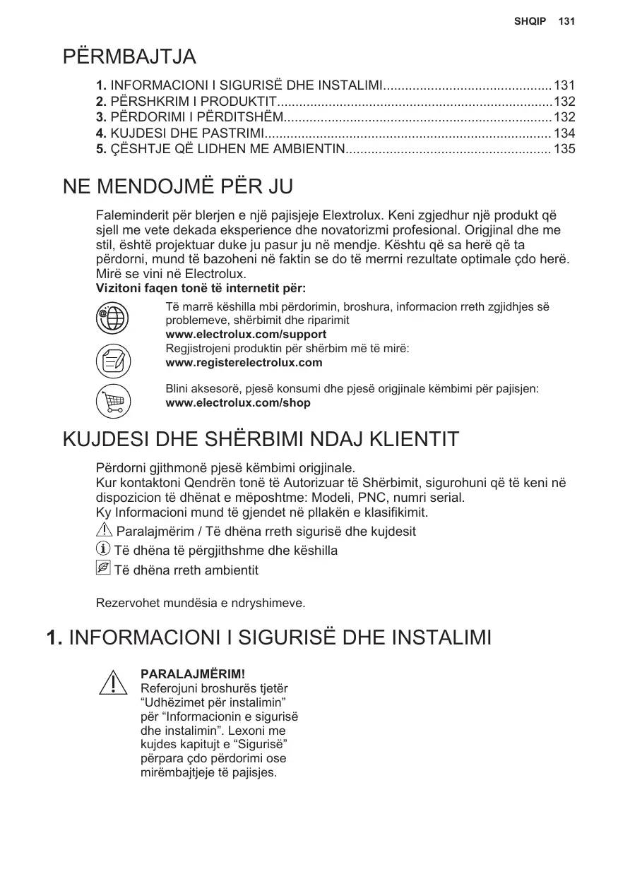 Faleminderit për blerjen e një pajisjeje Elextrolux. Keni zgjedhur një produkt që sjell me vete dekada eksperience dhe novatorizmi profesional. Origjinal dhe me stil, është projektuar duke ju pasur ju në mendje. Kështu që sa herë që ta përdorni, mund të bazoheni në faktin se do të merrni rezultate optimale çdo herë. Mirë se vini në Electrolux. Vizitoni faqen tonë të internetit për: Të marrë këshilla mbi përdorimin, broshura, informacion rreth zgjidhjes së problemeve, shërbimit dhe riparimit www.electrolux.com/support Regjistrojeni produktin për shërbim më të mirë: www.registerelectrolux.com Blini aksesorë, pjesë konsumi dhe pjesë origjinale këmbimi për pajisjen: www.electrolux.com/shop