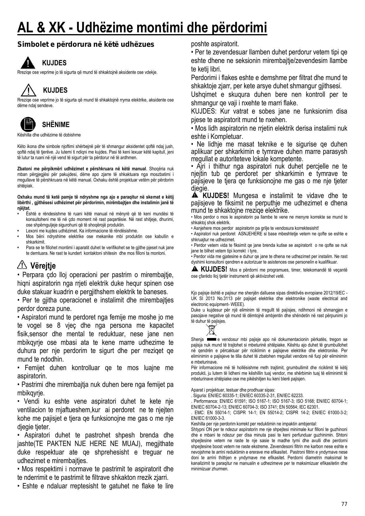 AL & XK - Udhëzime montimi dhe përdorimi Simbolet e përdorura në këtë udhëzues KUJDES Rreziqe ose veprime jo të sigurta që mund të shkaktojnë aksidente ose vdekje.