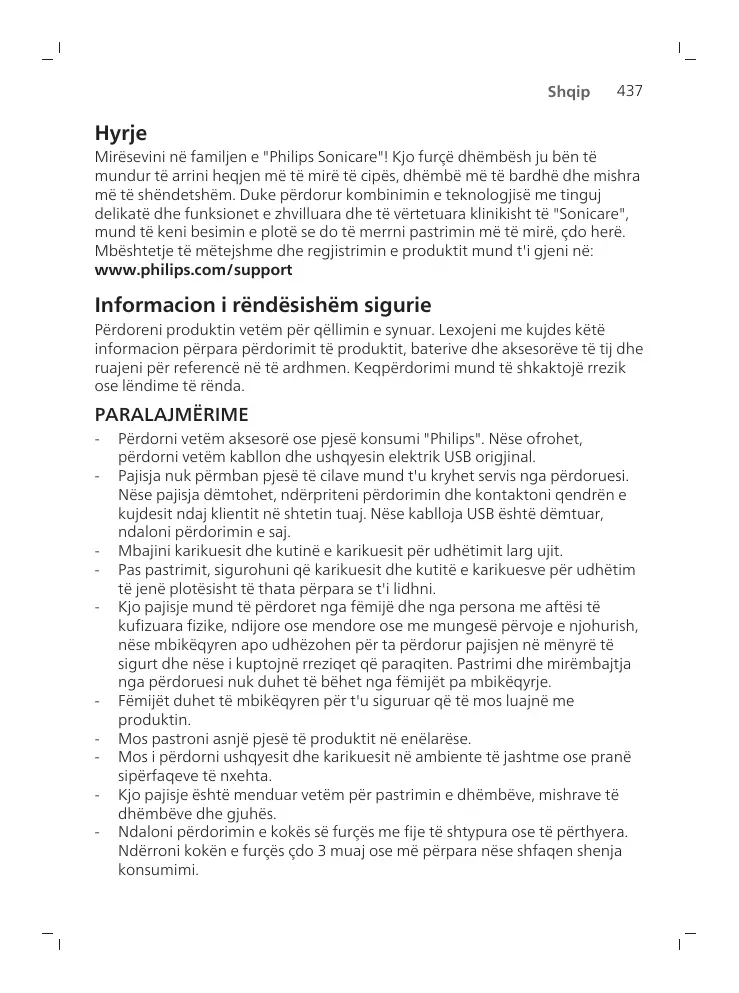 Përdorni vetëm aksesorë ose pjesë konsumi "Philips". Nëse ofrohet, përdorni vetëm kabllon dhe ushqyesin elektrik USB origjinal. Pajisja nuk përmban pjesë të cilave mund t'u kryhet servis nga përdoruesi. Nëse pajisja dëmtohet, ndërpriteni përdorimin dhe kontaktoni qendrën e kujdesit ndaj klientit në shtetin tuaj. Nëse kablloja USB është dëmtuar, ndaloni përdorimin e saj. Mbajini karikuesit dhe kutinë e karikuesit për udhëtimit larg ujit. Pas pastrimit, sigurohuni që karikuesit dhe kutitë e karikuesve për udhëtim të jenë plotësisht të thata përpara se t'i lidhni. Kjo pajisje mund të përdoret nga fëmijë dhe nga persona me aftësi të kufizuara fizike, ndijore ose mendore ose me mungesë përvoje e njohurish, nëse mbikëqyren apo udhëzohen për ta përdorur pajisjen në mënyrë të sigurt dhe nëse i kuptojnë rreziqet që paraqiten. Pastrimi dhe mirëmbajtja nga përdoruesi nuk duhet të bëhet nga fëmijët pa mbikëqyrje. Fëmijët duhet të mbikëqyren për t'u siguruar që të mos luajnë me produktin. Mos pastroni asnjë pjesë të produktit në enëlarëse. Mos i përdorni ushqyesit dhe karikuesit në ambiente të jashtme ose pranë sipërfaqeve të nxehta. Kjo pajisje është menduar vetëm për pastrimin e dhëmbëve, mishrave të dhëmbëve dhe gjuhës. Ndaloni përdorimin e kokës së furçës me fije të shtypura ose të përthyera. Ndërroni kokën e furçës çdo 3 muaj ose më përpara nëse shfaqen shenja konsumimi.