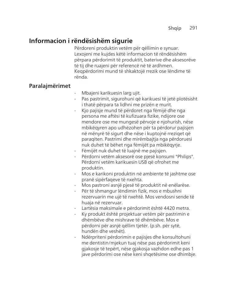 Mbajeni karikuesin larg ujit. Pas pastrimit, sigurohuni që karikuesi të jetë plotësisht i thatë përpara ta lidhni me prizën e murit. Kjo pajisje mund të përdoret nga fëmijë dhe nga persona me aftësi të kufizuara fizike, ndijore ose mendore ose me mungesë përvoje e njohurish, nëse mbikëqyren apo udhëzohen për ta përdorur pajisjen në mënyrë të sigurt dhe nëse i kuptojnë rreziqet që paraqiten. Pastrimi dhe mirëmbajtja nga përdoruesi nuk duhet të bëhet nga fëmijët pa mbikëqyrje. Fëmijët nuk duhet të luajnë me pajisjen. Përdorni vetëm aksesorë ose pjesë konsumi "Philips". Përdorni vetëm karikuesin USB që ofrohet me produktin. Mos e karikoni produktin në ambiente të jashtme ose pranë sipërfaqeve të nxehta. Mos pastroni asnjë pjesë të produktit në enëlarëse. Për të shmangur lëndimin fizik, mos e mbushni rezervuarin me ujë të nxehtë. Mos vendosni sende të huaja në rezervuar. Lartësia maksimale e përdorimit është 4420 metra. Ky produkt është projektuar vetëm për pastrimin e dhëmbëve dhe mishrave të dhëmbëve. Mos e përdorni për asnjë qëllim tjetër. (p.sh. për sytë, hundën dhe veshët). Ndërpriteni përdorimin e pajisjes dhe konsultohuni me dentistin/mjekun tuaj nëse pas përdorimit keni gjakosje të tepërt, nëse gjakosja vazhdon edhe pas 1 jave përdorimi ose nëse keni shqetësime ose dhimbje.