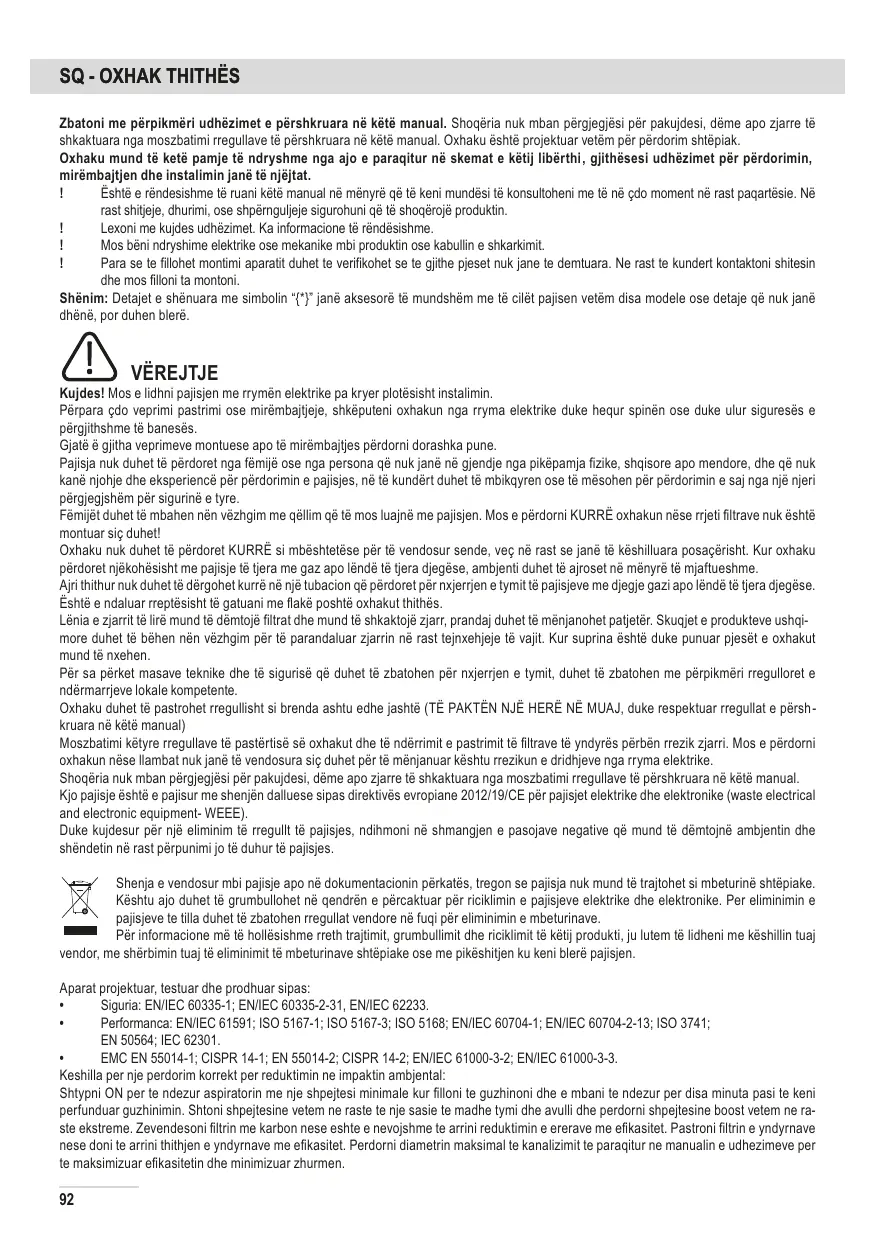 SQ - OXHAK THITHËS Zbatoni me përpikmëri udhëzimet e përshkruara në këtë manual. Shoqëria nuk mban përgjegjësi për pakujdesi, dëme apo zjarre të shkaktuara nga moszbatimi rregullave të përshkruara në këtë manual. Oxhaku është projektuar vetëm për përdorim shtëpiak. Oxhaku mund të ketë pamje të ndryshme nga ajo e paraqitur në skemat e këtij libërthi, gjithësesi udhëzimet për përdorimin, mirëmbajtjen dhe instalimin janë të njëjtat. ! Është e rëndesishme të ruani këtë manual në mënyrë që të keni mundësi të konsultoheni me të në çdo moment në rast paqartësie. Në rast shitjeje, dhurimi, ose shpërnguljeje sigurohuni që të shoqërojë produktin. ! Lexoni me kujdes udhëzimet. Ka informacione të rëndësishme. ! Mos bëni ndryshime elektrike ose mekanike mbi produktin ose kabullin e shkarkimit. ! Para se te fillohet montimi aparatit duhet te verifikohet se te gjithe pjeset nuk jane te demtuara. Ne rast te kundert kontaktoni shitesin dhe mos filloni ta montoni. Shënim: Detajet e shënuara me simbolin “{*}” janë aksesorë të mundshëm me të cilët pajisen vetëm disa modele ose detaje që nuk janë dhënë, por duhen blerë.